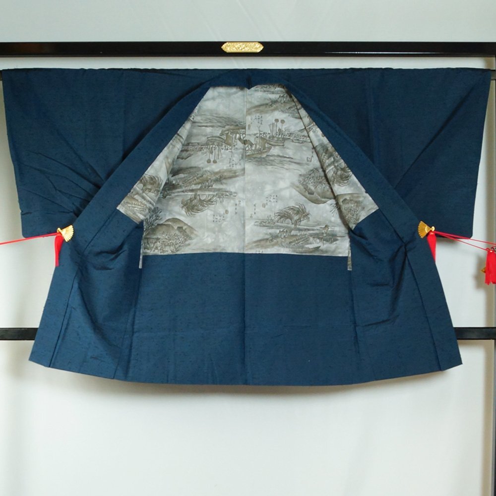 | 商品 説明 | 濃紺色系のしっかりとした生地感の無地の紬の着物と同生地にひげが施された羽織のアンサンブルと、藍鉄色系の地に網代模様の地織が施された角帯の3点セットです。羽裏は東海道五十三次模様です。羽織紐は付いておりません。 |
