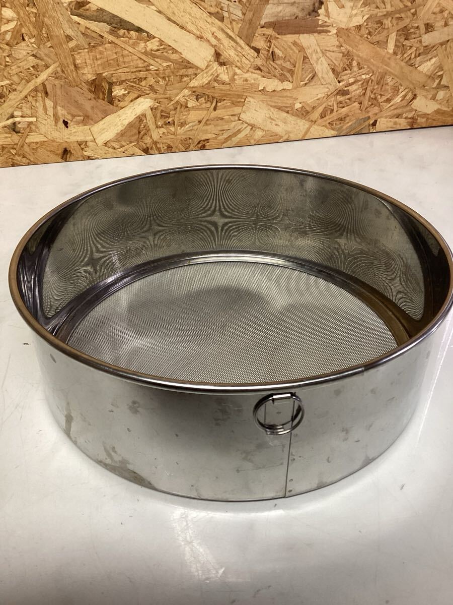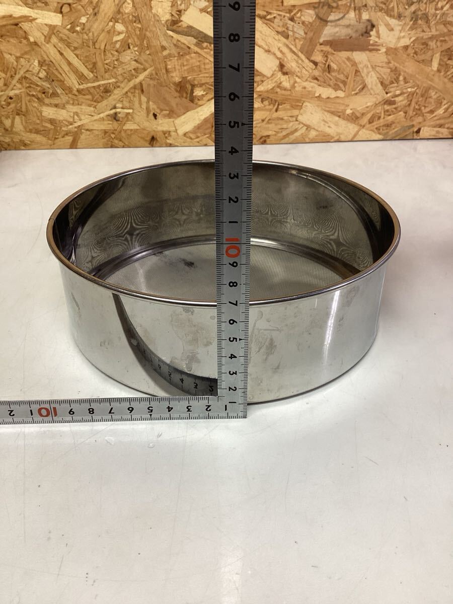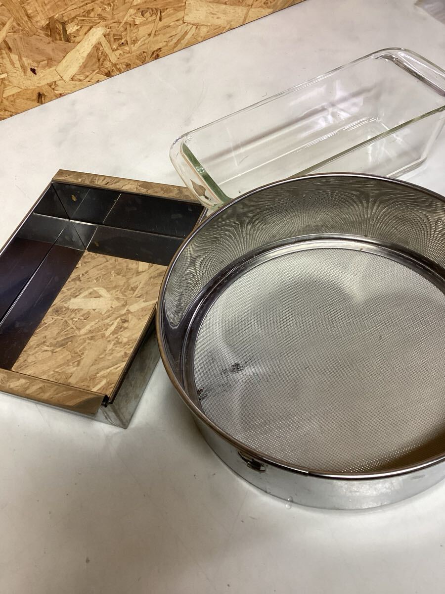 ステンレス製のふるいとガラス製のベーキングディッシュのセット。
