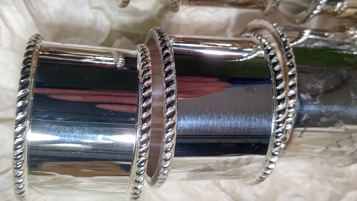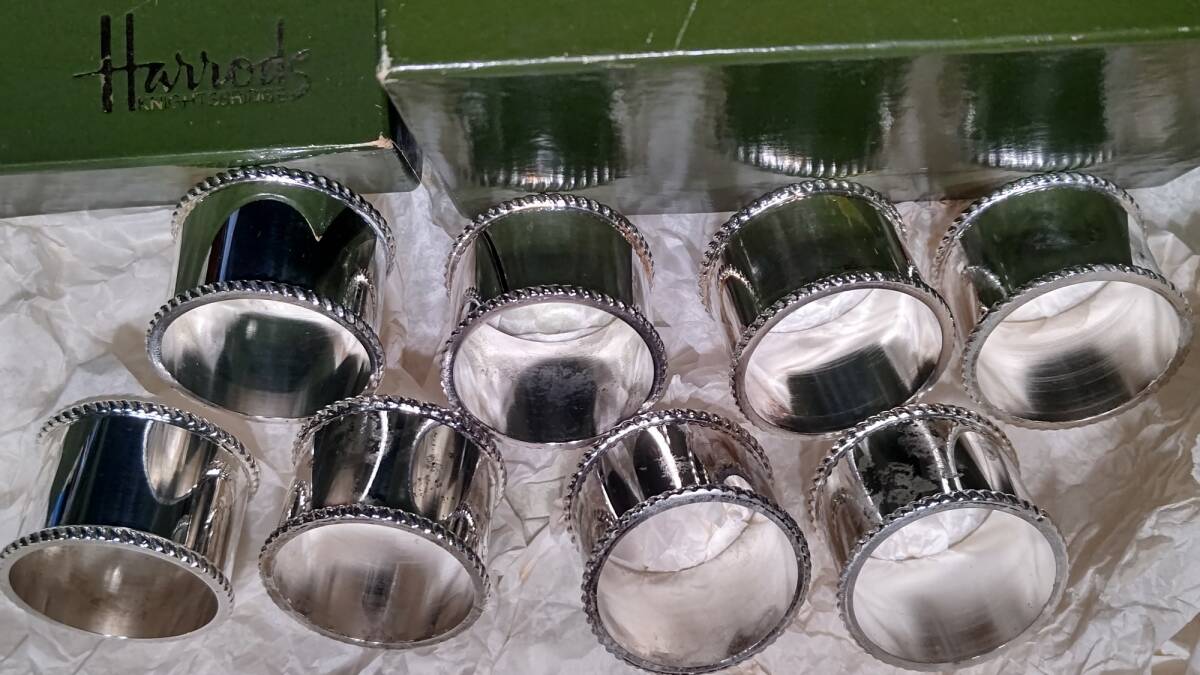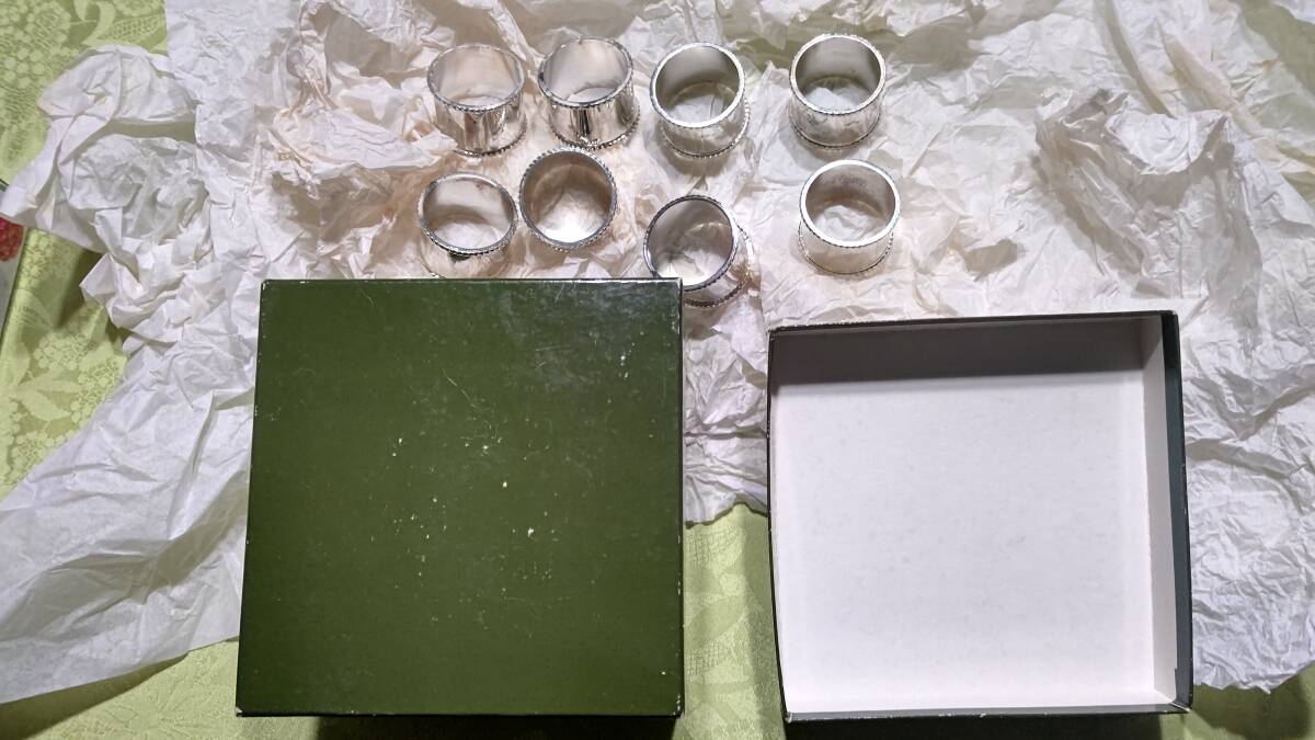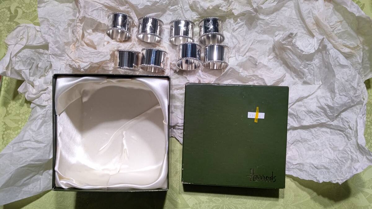 331-1 ヴィンテージ 英国 ハロッズ シルバープレート ナプキンリング 8個セット(直径4.4㎝幅3㎝合計重量383g)箱入り