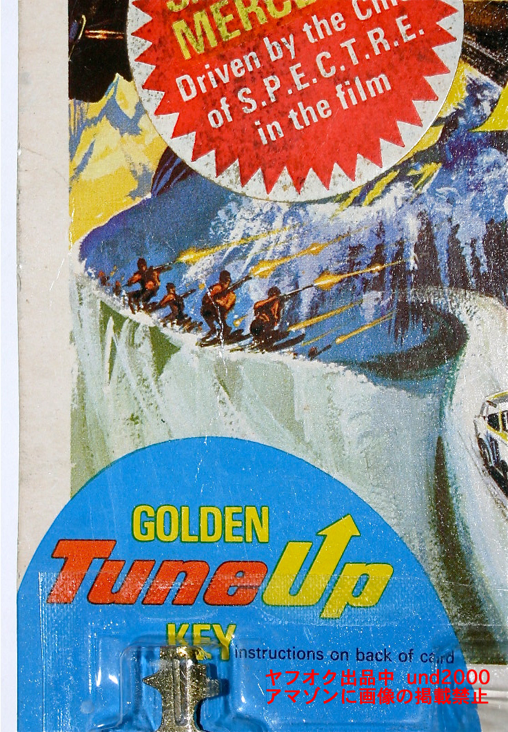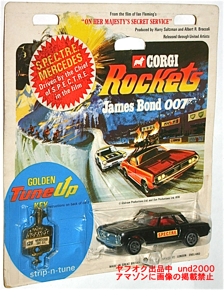 1970年 コーギー・ロケット、「女王陛下の007」 S.P.E.C.T.R.E. Mercedes。トミカ、ホット・ホイール・サイズ。未開封品。本体、キーのシールにのりシミあり。パッケージに薄汚れ、ブリスターにスレ、底の出っ張り部分にシワがあり、小さな穴があります(大きな割れはありません)。台紙に弱いシワ、ステッカーにのりシミがあります。古い物ですので、説明と画像をよくご確認の上、ノークレームでお願いいたします。お支払いはヤフーかんたん決済のみ。発送は東京発、ゆうパック持込60サイズ(東京700円 - 沖縄1330円)、レターパックプラス600円、定形外郵便(追跡番号、保険なし)450円になります。(上記の送料はこの出品物のみの料金となります。複数落札、同梱包発送の場合、重さ、サイズが変わりますので送料が変わります。)3日以内のご連絡、かんたん決済の支払期限内(通常5日、支払方法により異なります)のお支払い厳守でお願いします。入札される前に自己紹介もお読みください。 検索用ワード James Bond ジェームズ・ボンド On Her Majesty's Secret Service SPECTRE Corgi Rockets ボンドカー
