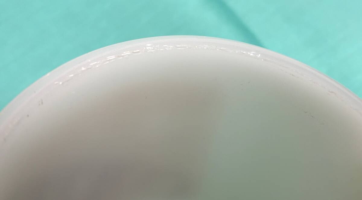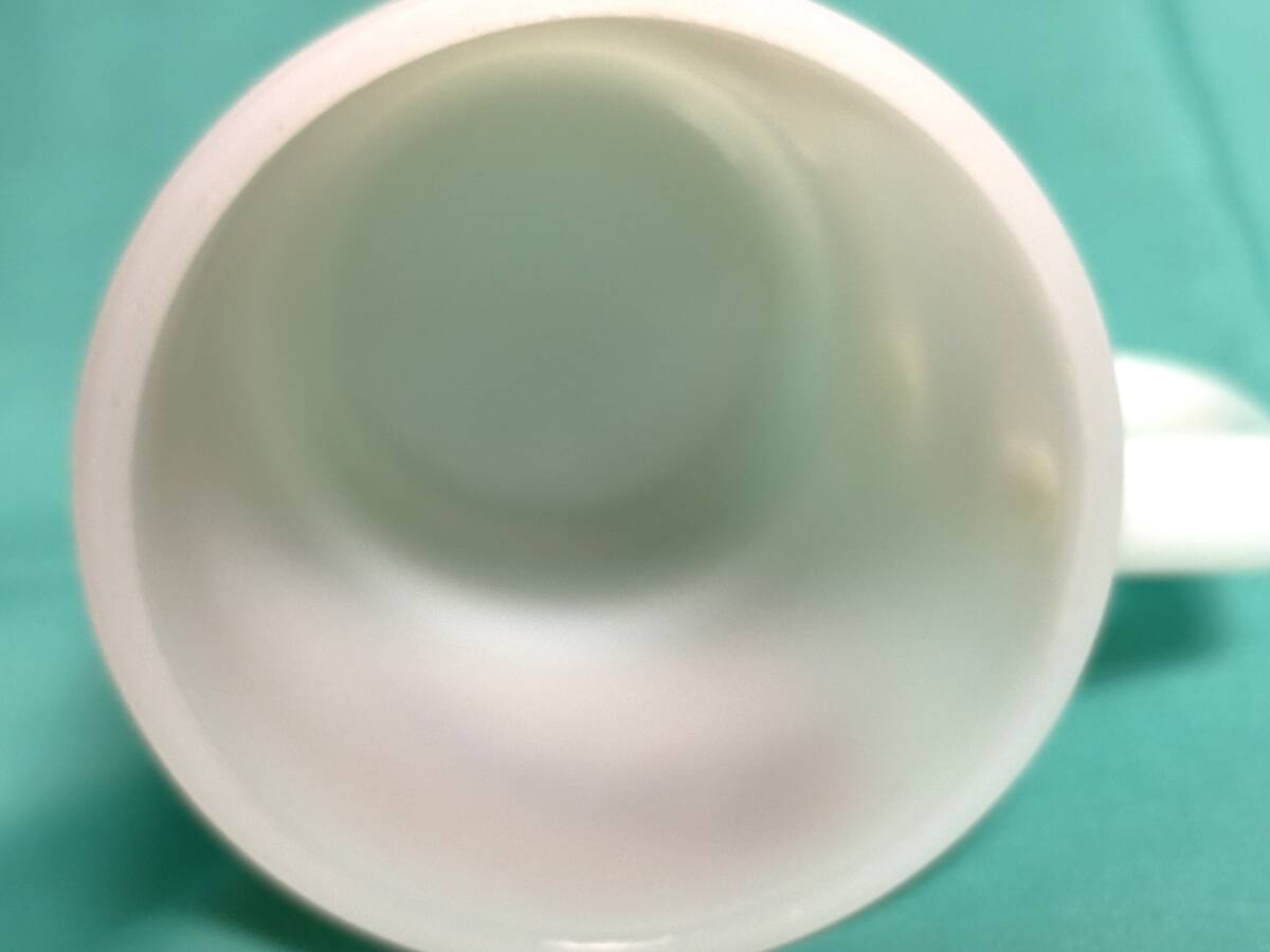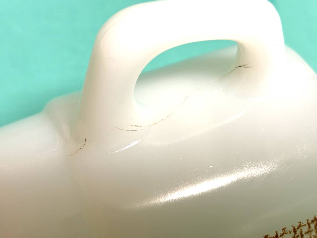 持ち手近くにヘアーラインがあり、着色しています。また、口元に欠けが見られます。