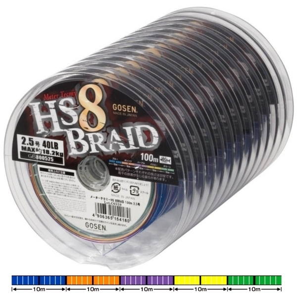 GOSEN メーターテクミーHS 8BRAIDO(8本編組) 100m連結 5色分け ★最長1200mまで連結可能 (100m単位で連結1200mまでご購入頂けます。) 高強力8ブレイドPEラインを長巻出来る! すべり抜群!あたり抜群!信頼の日本製100%PEライン、新登場! 高強力8本組PEライン連結品が登場! SDE製法採用!PEの強度と耐久性を最大限まで引き出す事に成功! 高強力8本組PEラインを最大1,200mまで巻ける! マルチカラー(10m毎5色分、1m白抜き、5m白黒白)で船釣からジギングまで対応