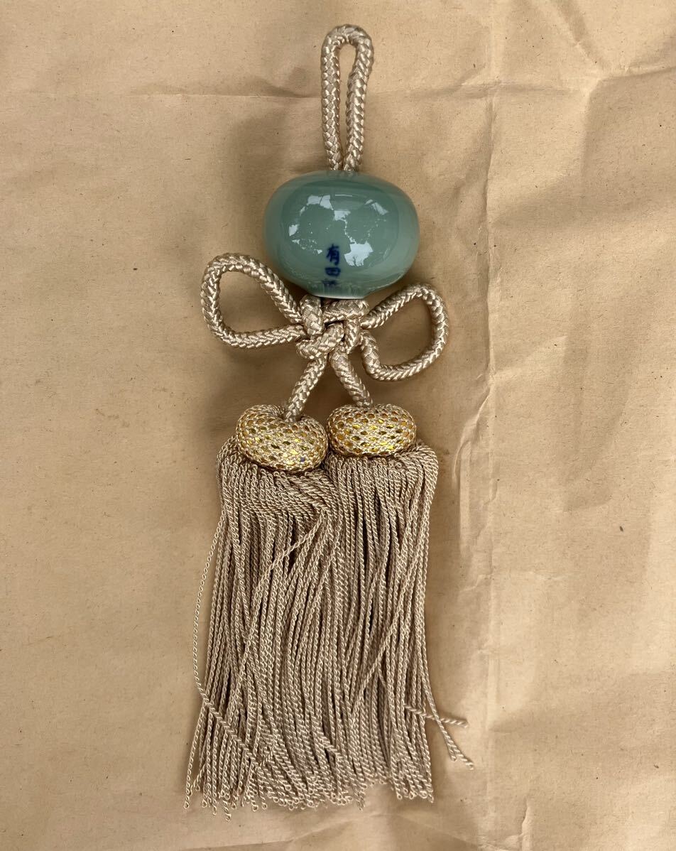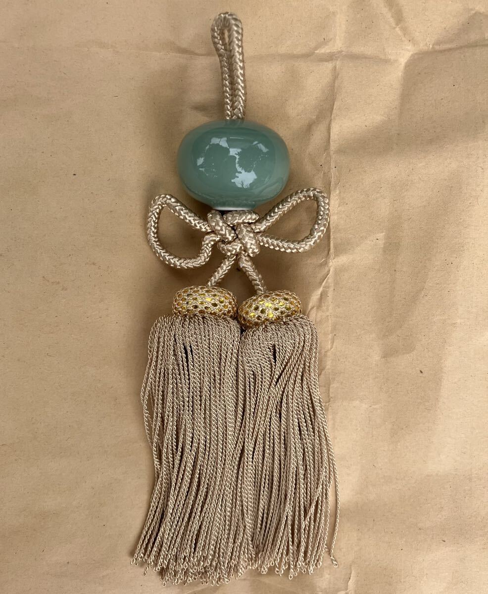 翡翠のような色目の陶器がついたふさ飾りです