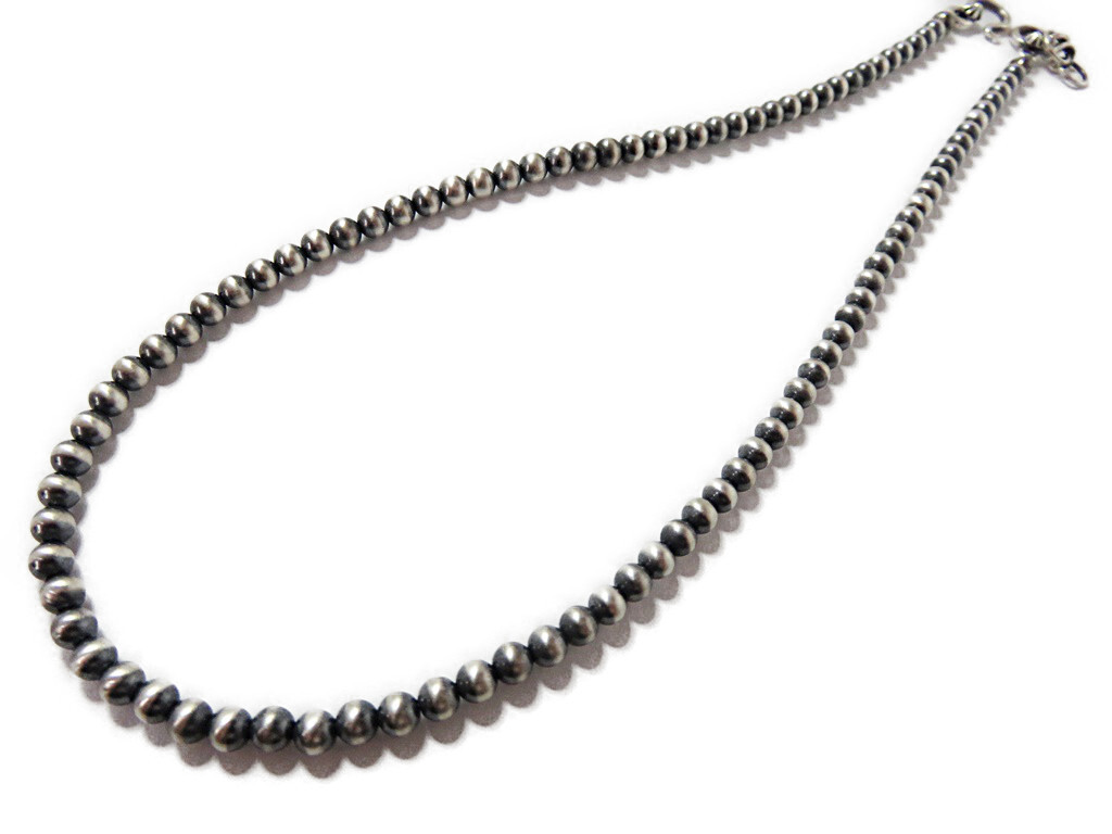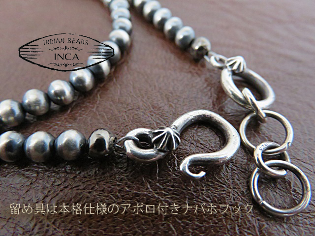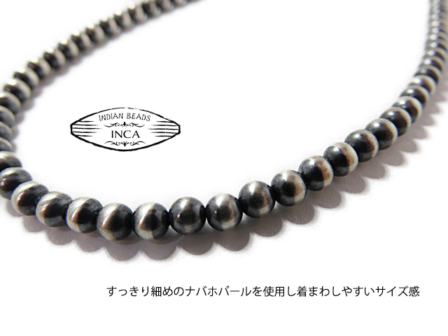 当店オリジナルインディアンビーズブランド【INCA】のハンドメイド作品になります。ナバホパールビーズを当店にてカスタムメイドしたインディアンビーズネックレスになります。アメリカ先住民のナバホ族から始まり表面はシルバー本来の輝きがあり、その両端に陰影を残すその仕上がりが真珠のように美しいことから現代ではナバホパールと呼ばれています。ビーズパーツの仕上がり陰影はそれぞれ異なります。ご了承ください。留め具は幅広のフックを採用していましたが外れやすいとのご意見があり、デザインは崩さずオリジナルのフック(外れにくい仕様※画像参照)に変更しています。