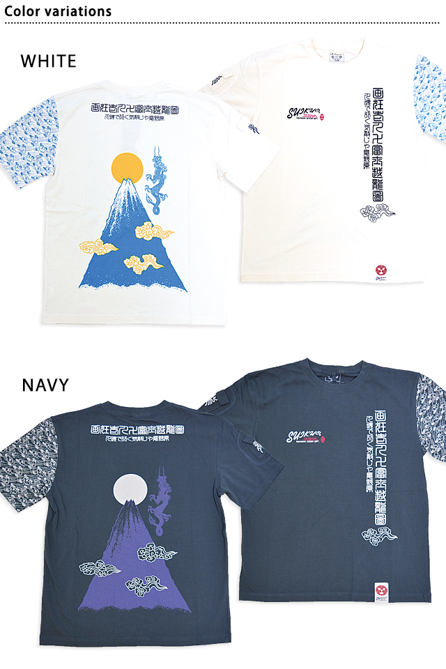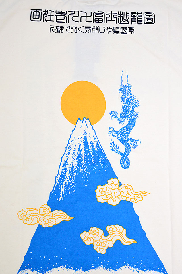 エフ商会が運営する虎の穴デザイン事務所から誕生した「粋狂」より「富士越龍図半袖Tシャツ(SYT-206)」のご紹介です。 北斎の晩年の作品「富士越龍図」と北斎の辞世の句「人魂で行く気散じや夏野原」をイメージしたデザインです。 バックにしっかり柄を入れている分、フロントはシンプルにまとめました。 左袖には雨と雲をイメージした総柄デザインを落とし込みました。 生地には、肌触りの良い粋狂さんお馴染みのよれにくいタフなボディーを採用。 | |||||||||||||||||||||||||