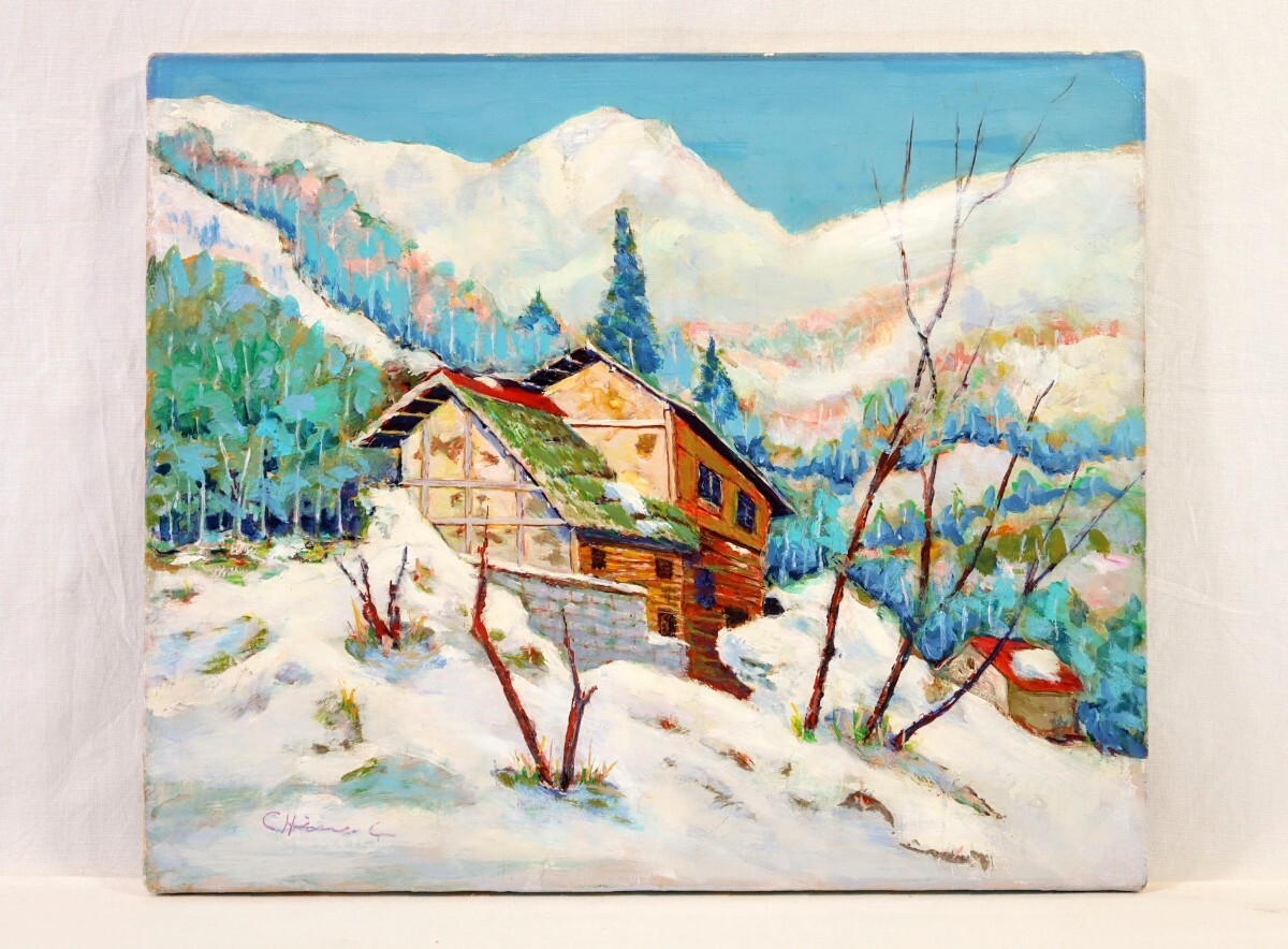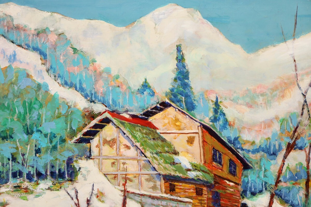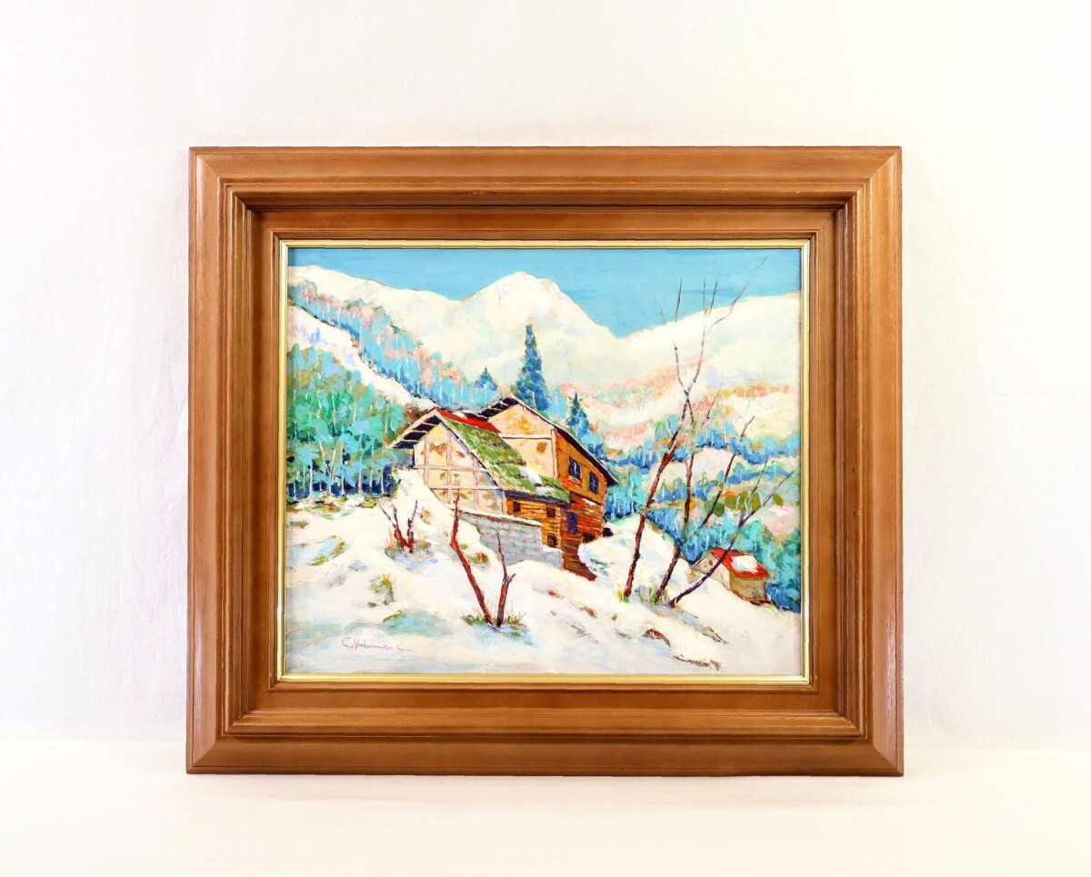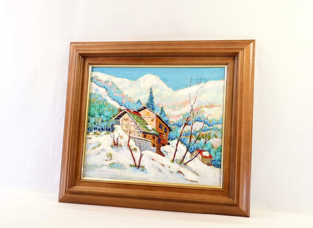 真作 千代忠 1987年晩年期油彩「野沢温泉」画寸 F8 滋賀県出身 新協美術委員 快晴の空とヒュッテのある雪景 明るい色使い、丁寧な筆致 9416