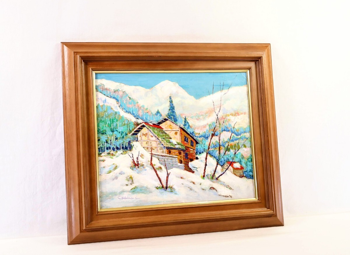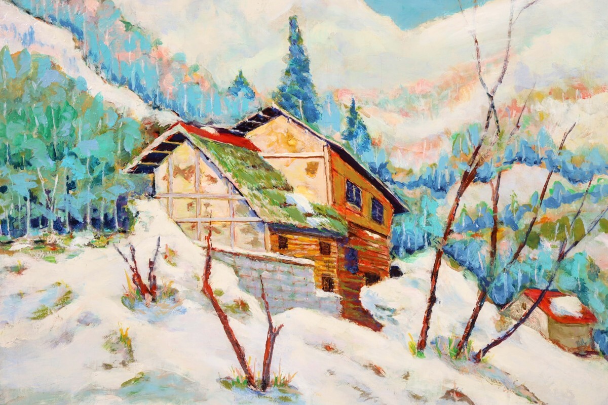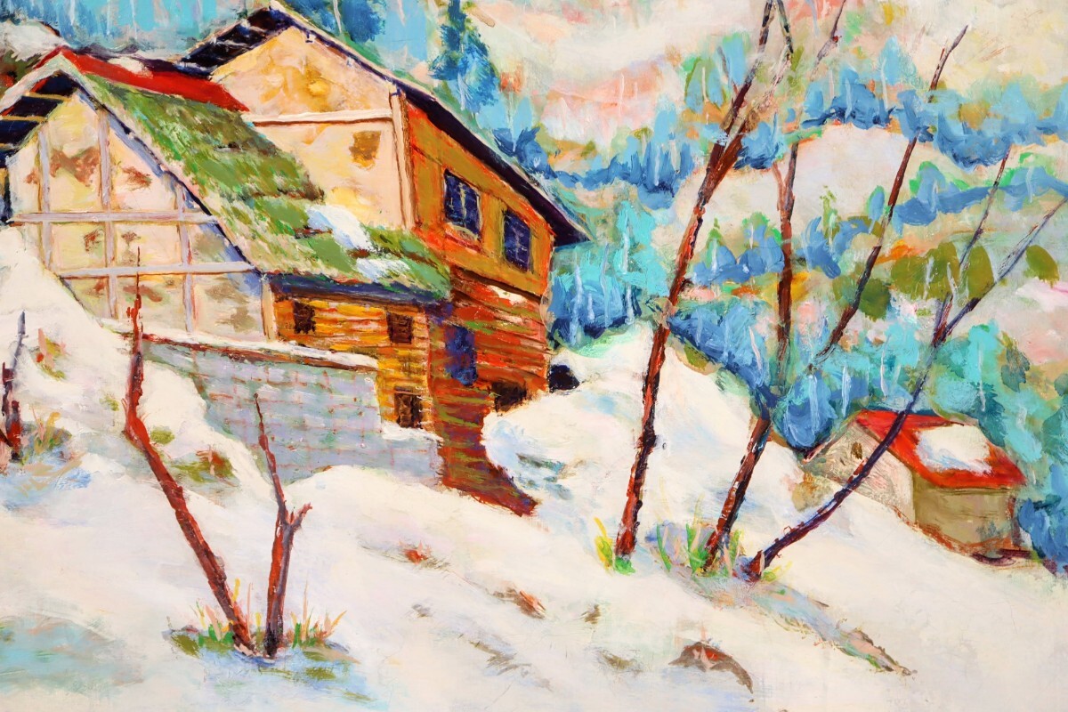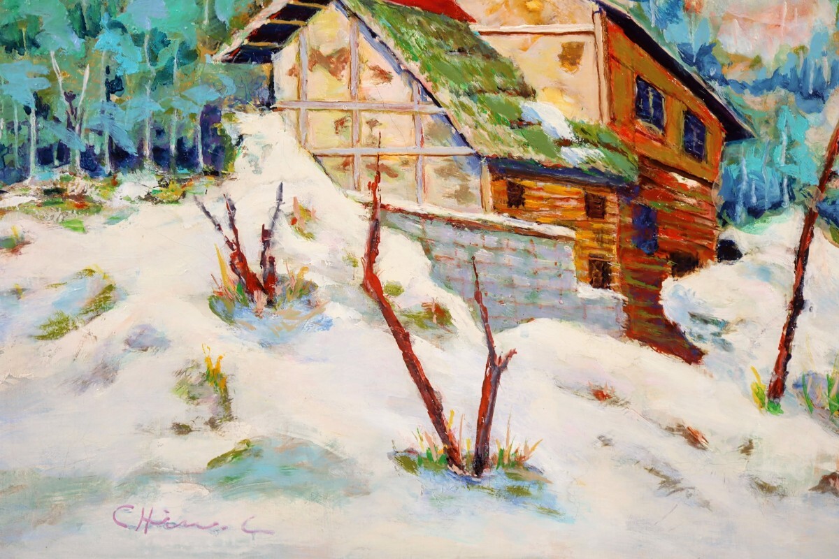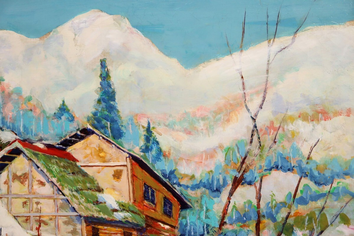 真作 千代忠 1987年晩年期油彩「野沢温泉」画寸 F8 滋賀県出身 新協美術委員 快晴の空とヒュッテのある雪景 明るい色使い、丁寧な筆致 9416