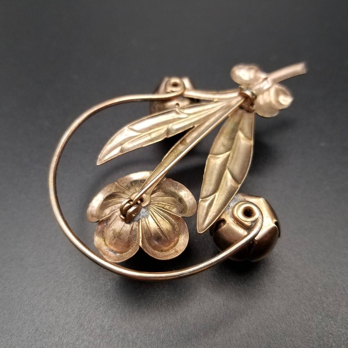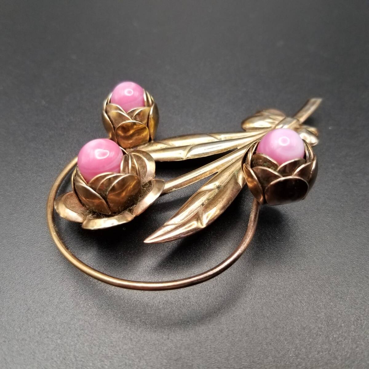 椿 花モチーフ ピンク石 カボション ヴィンテージ フラワー ブローチ ゴールドトーン 大ぶり 自然派 Y18-C