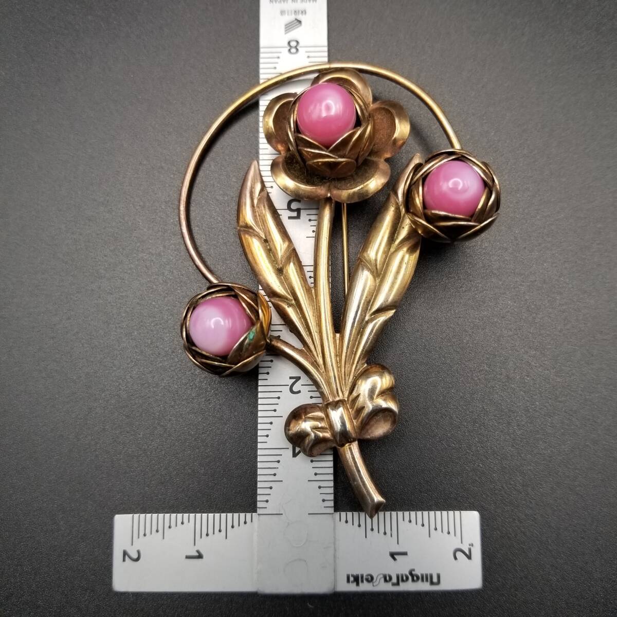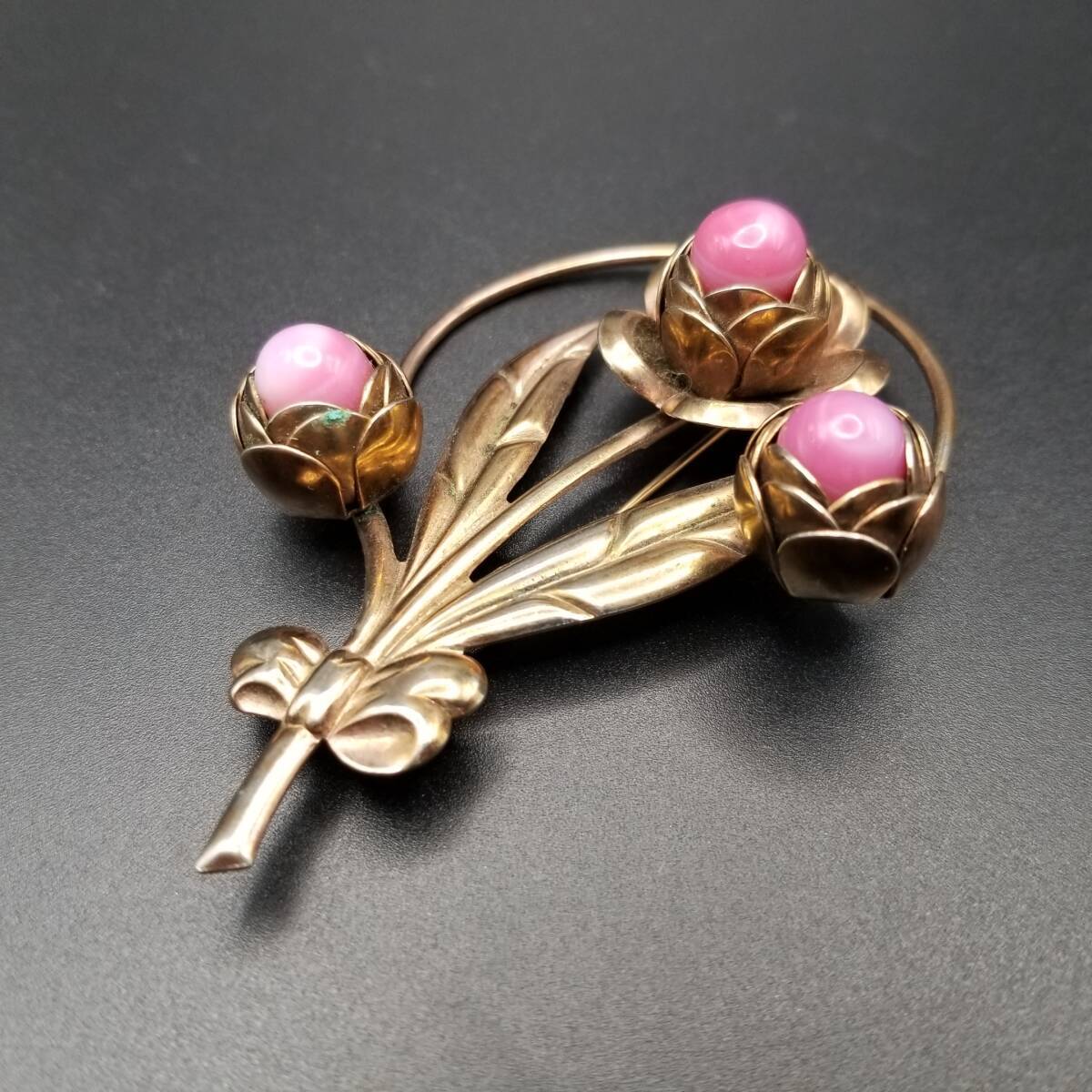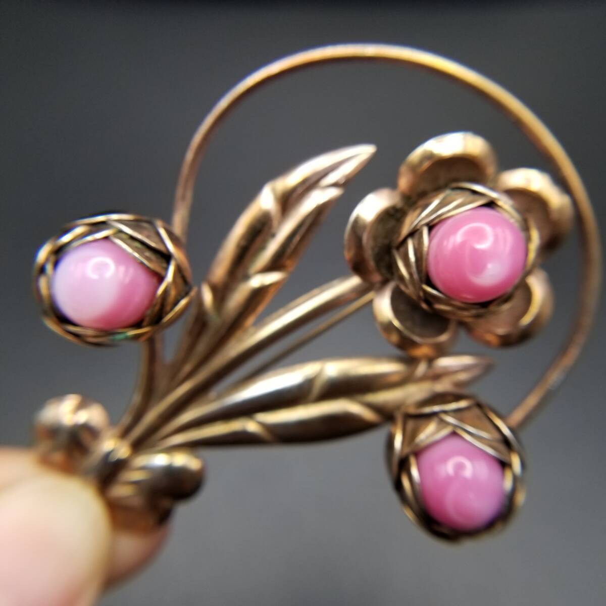 椿 花モチーフ ピンク石 カボション ヴィンテージ フラワー ブローチ ゴールドトーン 大ぶり 自然派 Y18-C
