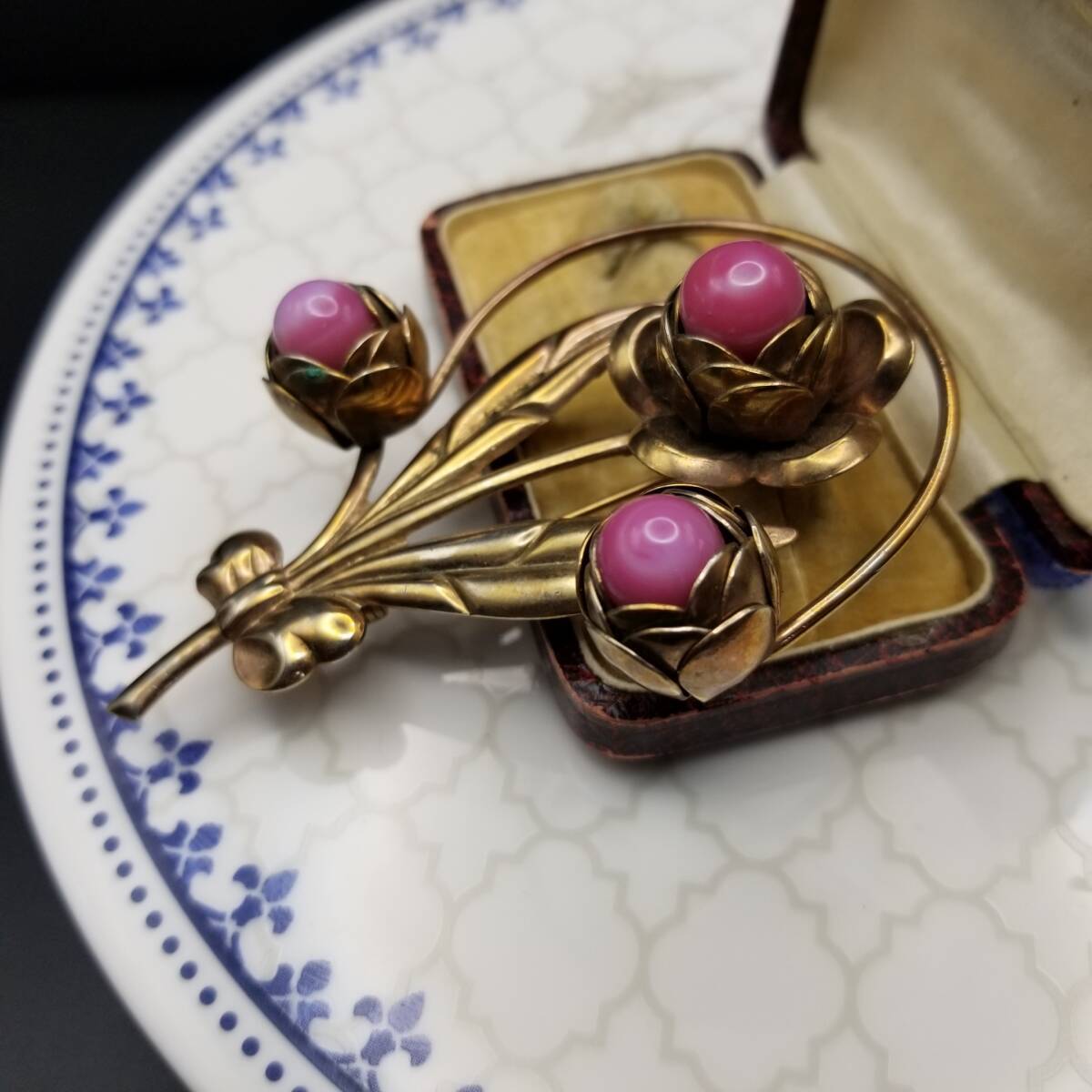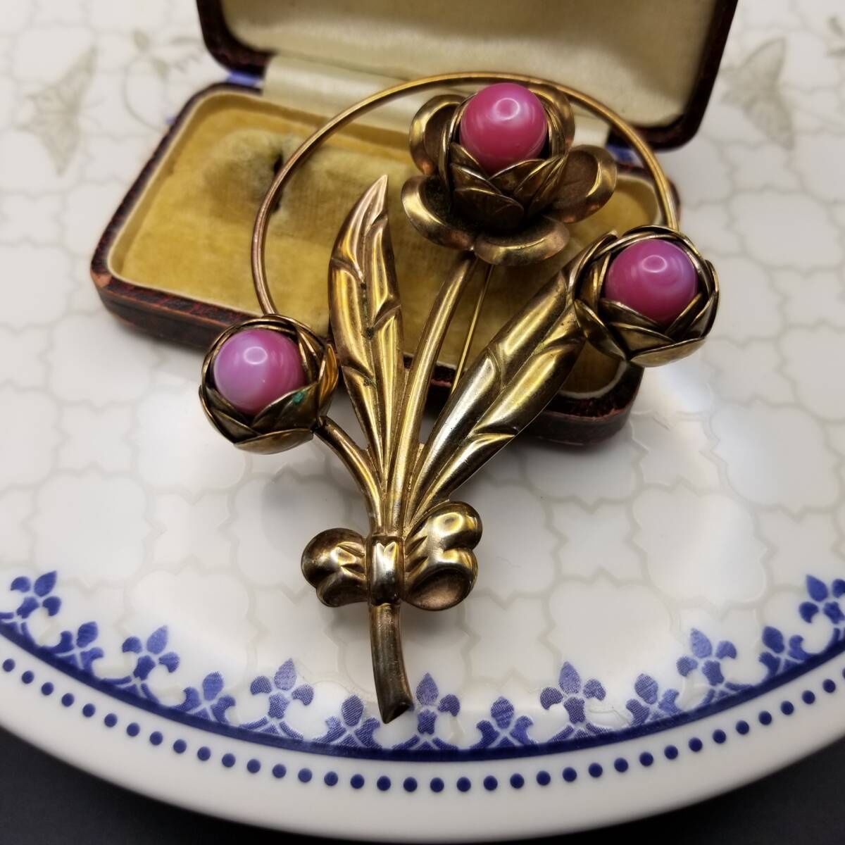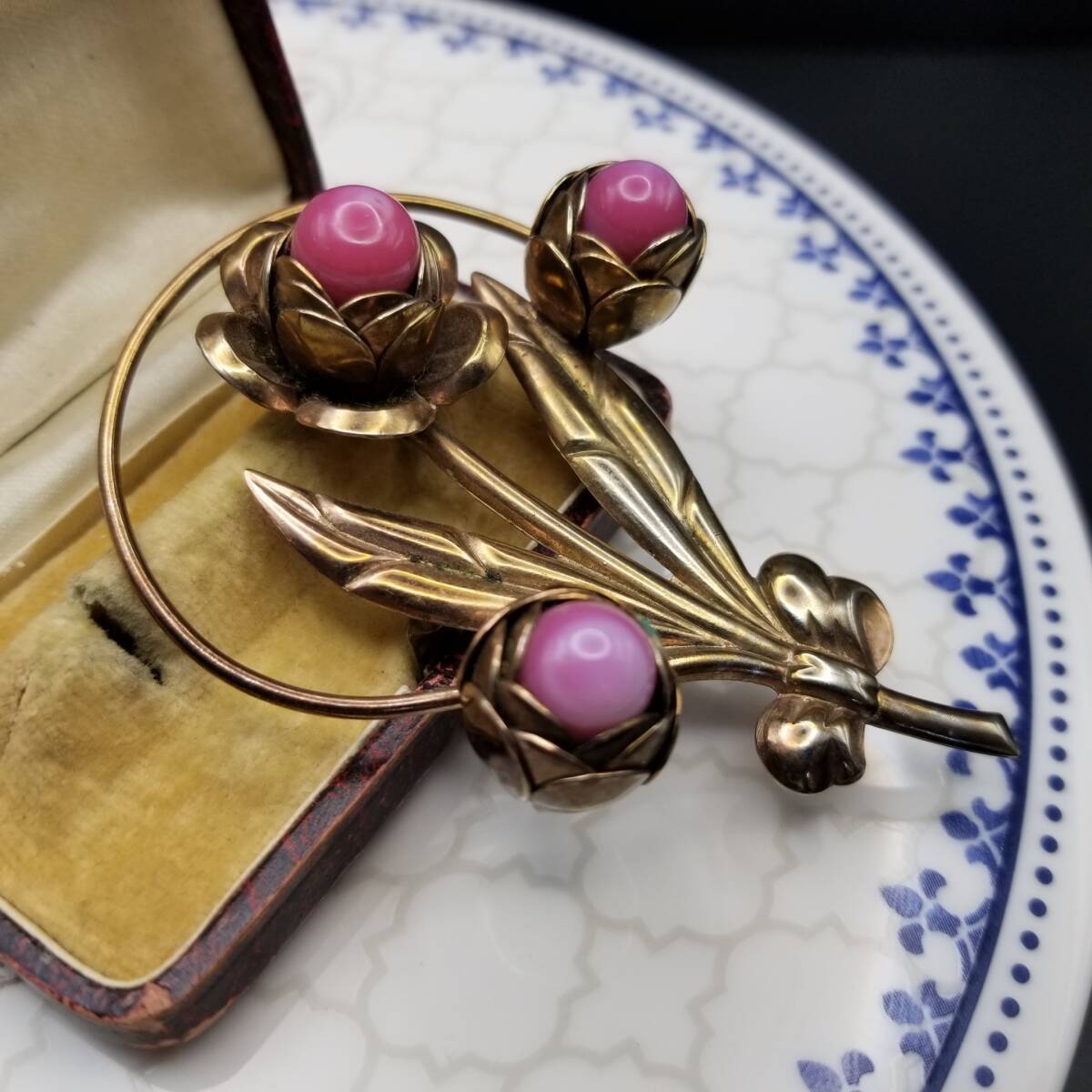 椿 花モチーフ ピンク石 カボション ヴィンテージ フラワー ブローチ ゴールドトーン 大ぶり 自然派 Y18-C
