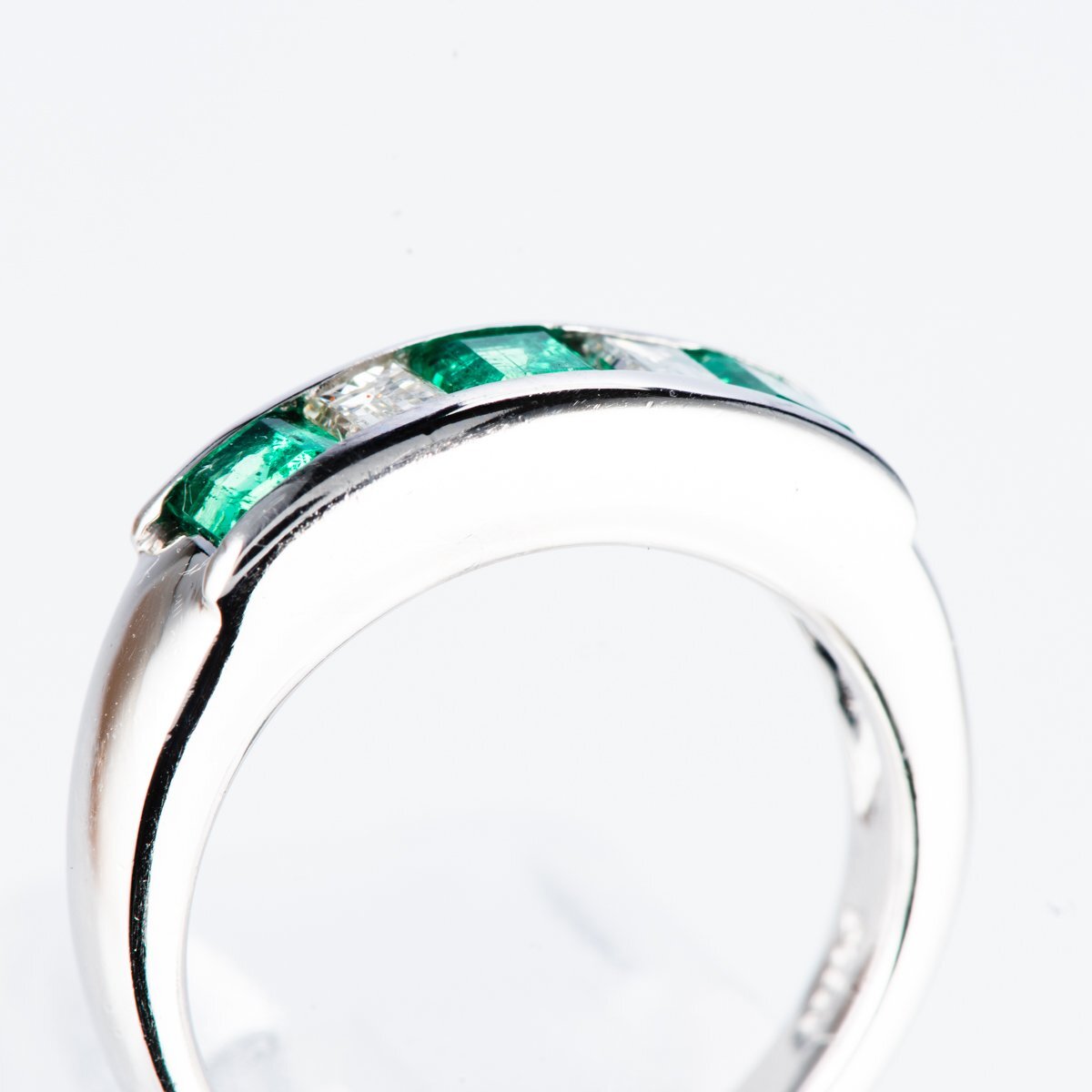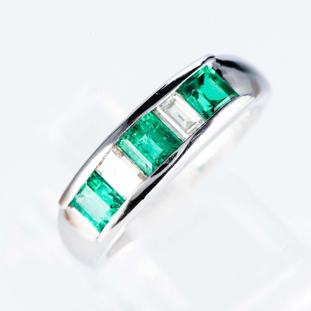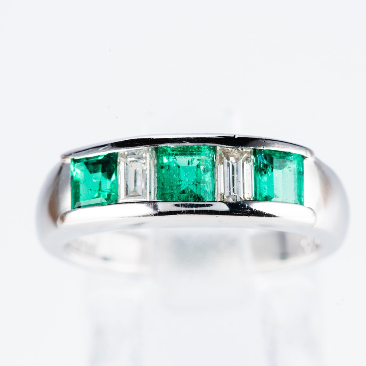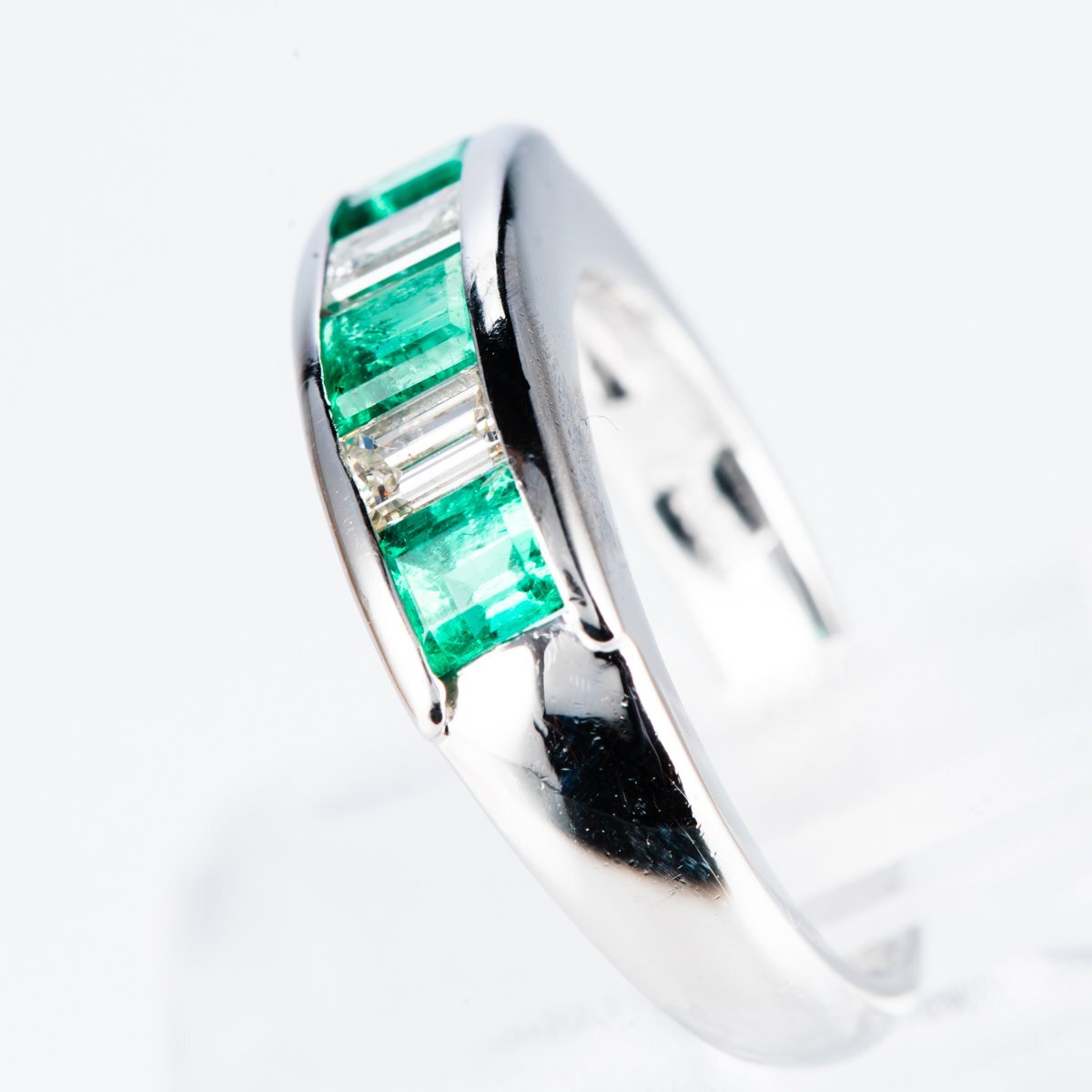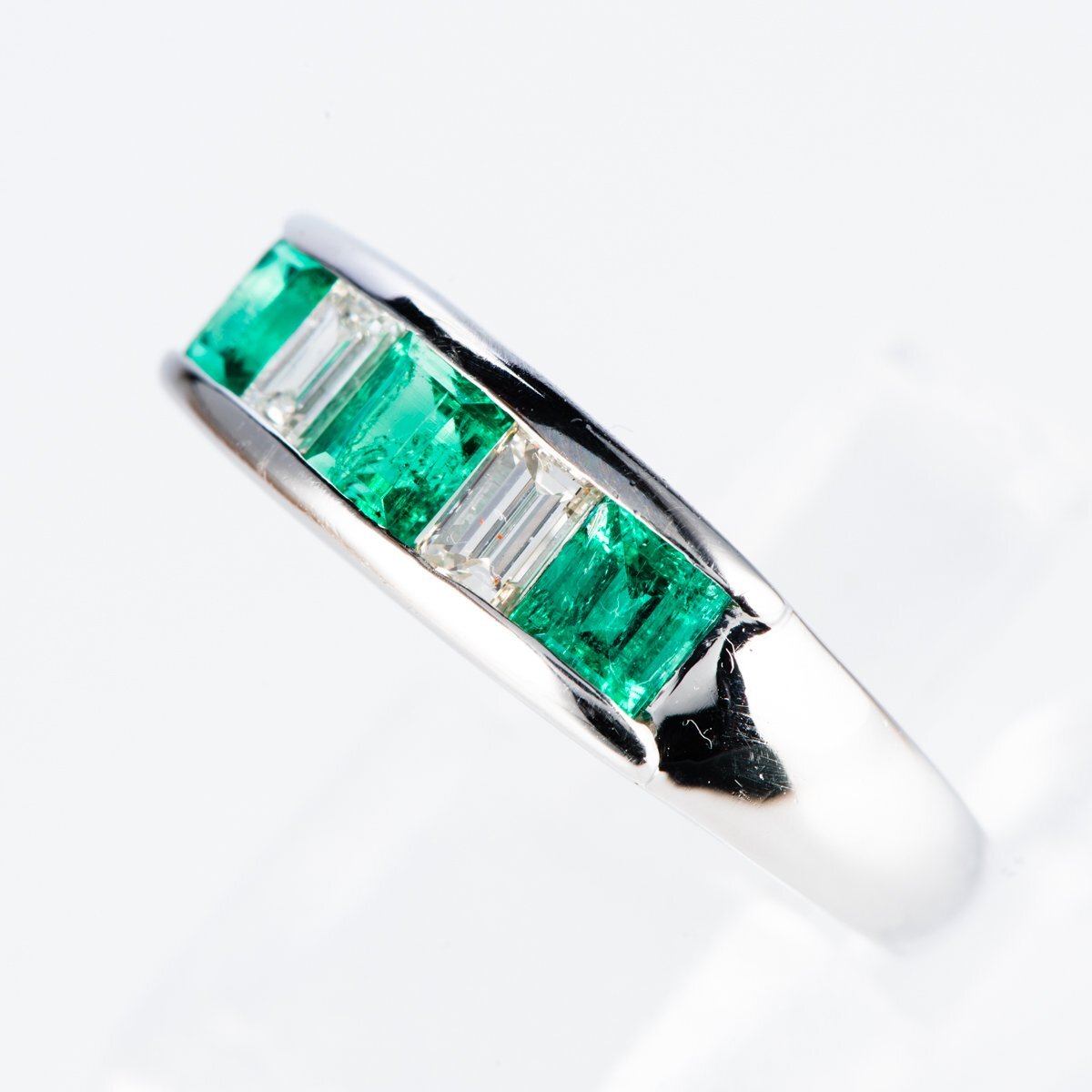 プラチナを使用したコロンビア産エメラルドとバゲットカットのダイヤモンドをセットしたミニマムなリング。