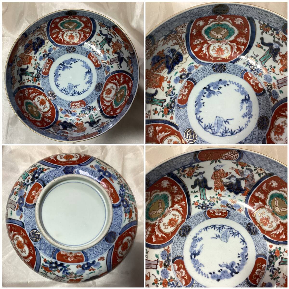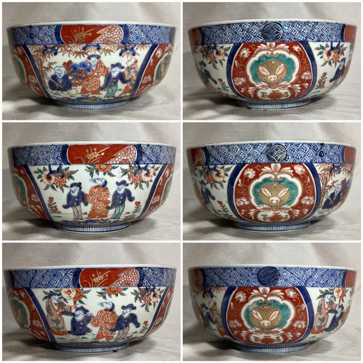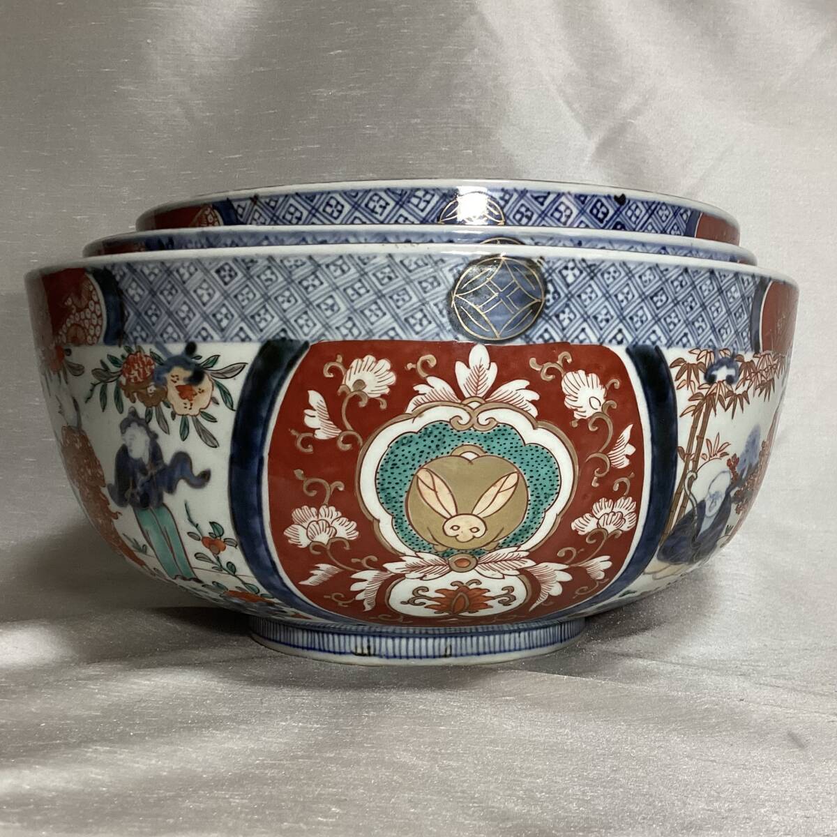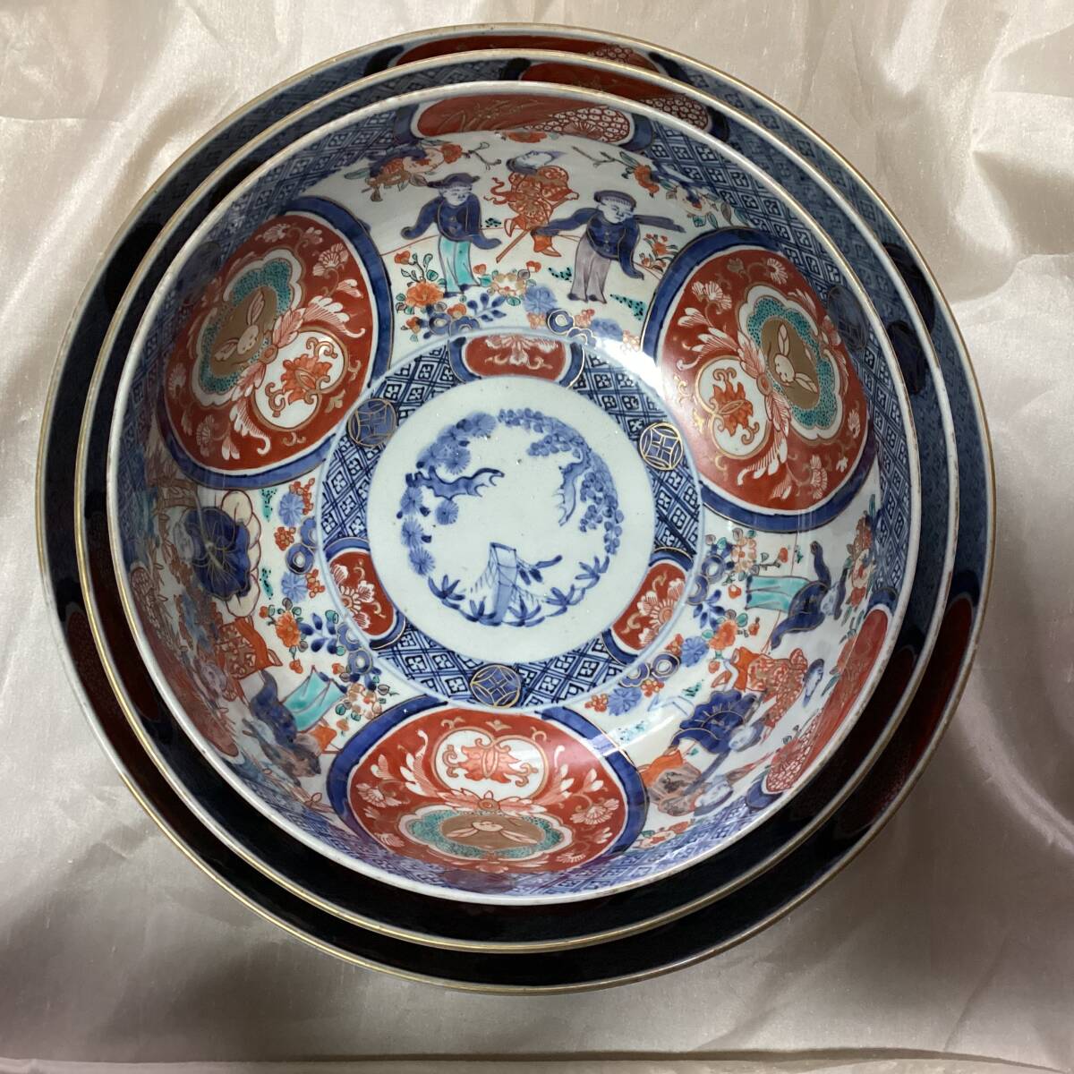 旧家の初だし 伊万里三重鉢 色絵金蘭手 阿蘭陀人と真向兎の図 櫛高台 鍋島? 幕末〜明治