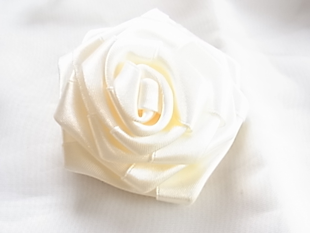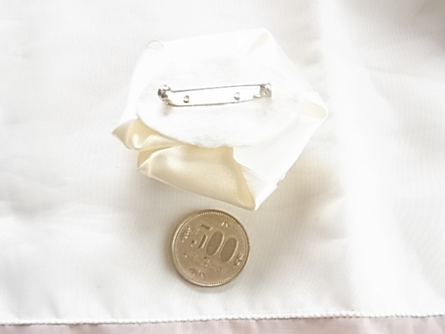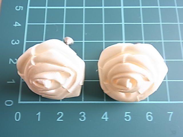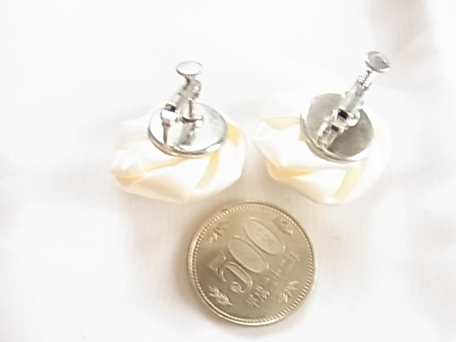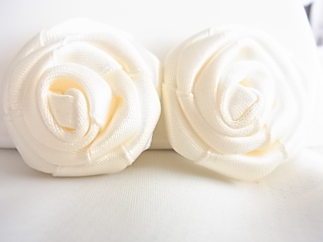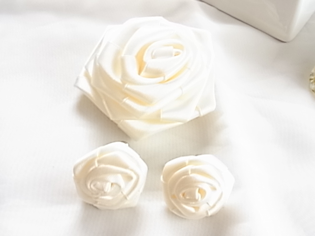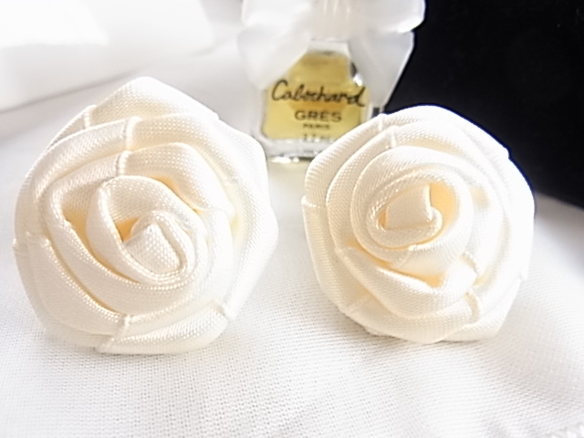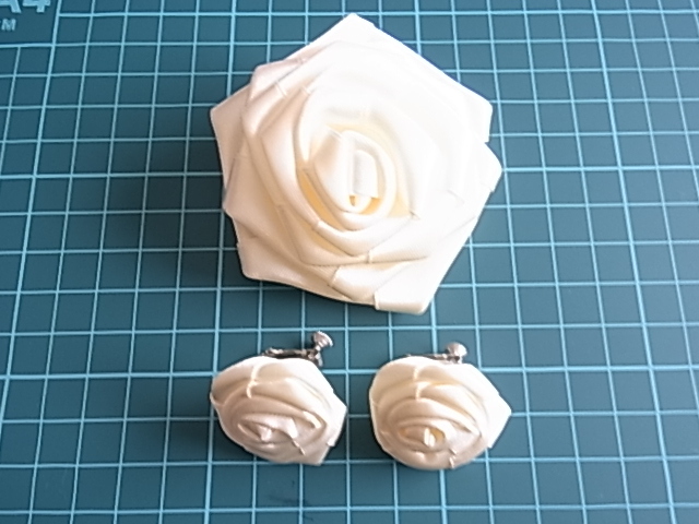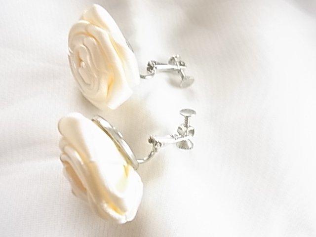 ビンテージ/ヴィンテージ お得な2点セット 綺麗なホワイトトーン 光沢感ある布生地で作成された薔薇の花の形イヤリングとブローチ▽