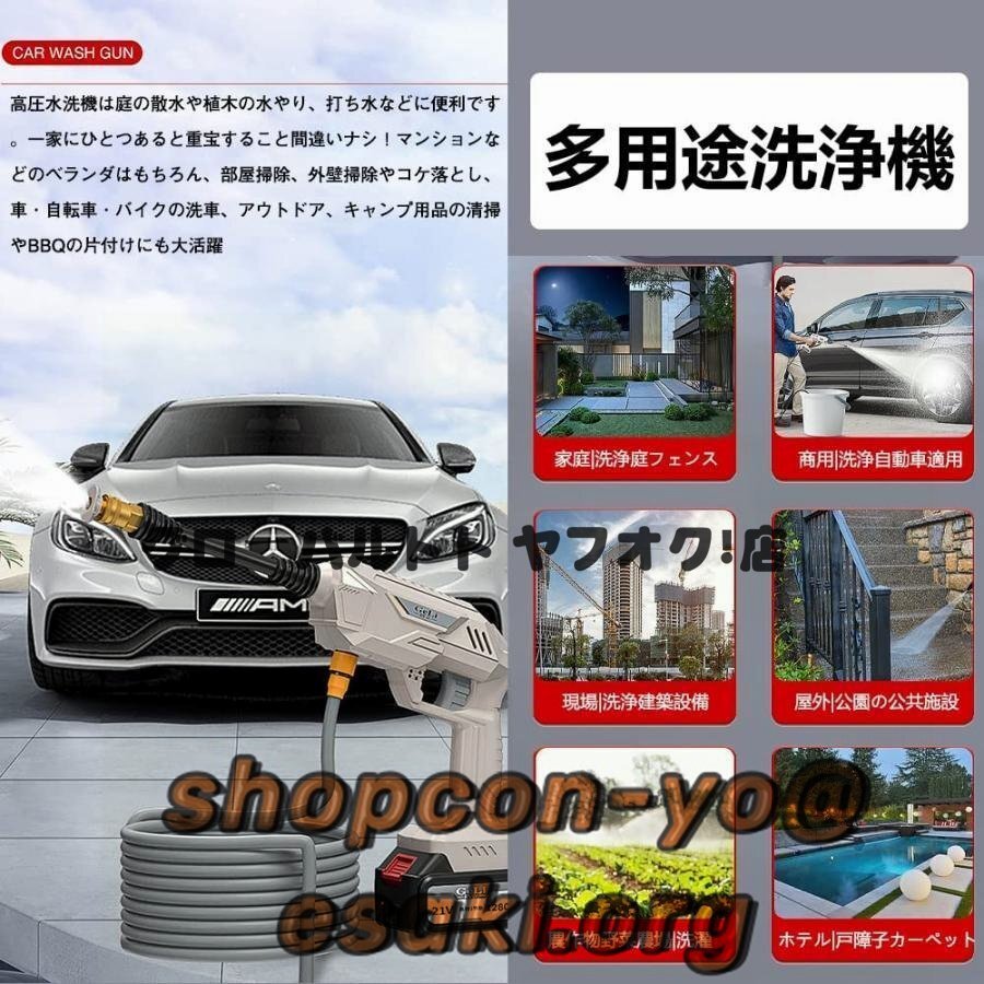 【高性能ハイパワー】高圧洗浄機のガンと本体が一体化した使い勝手の良いハンディウォッシャー。吐出圧力5Mpaのパワフルな高圧噴射で、ガンコな汚れを洗い流す高圧洗浄機です。家庭用洗浄機は高性能なパワーモーターを搭載して、水を素早く吸入・加圧して噴射します。多機能洗車ガンセット内容:本体、充電器、リチウムイオン充電バッテリー*2、回転ノズル、方向調整ノズル、フォームポット、フィルター付き専用給水管(5m)、ペットボトル用給水コネクター、収納箱.(ご注意:この商品はマキタブランドの製品ではありませんが、マキタバッテリーを使用することができます。)