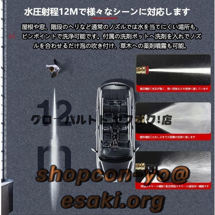 【アップグレードされた多機能ノズル】多機能洗車高圧ガンの特別に設計された多機能ノズルは、ノズルの先端を回すだけで「ガンコな汚れを落としたい」「庭のお花に水をあげたい」など適切な噴射モード(直噴、20度拡散、40度扇状拡散、泡噴射)に切り替えて使用できます。角度調整可能なノズルは、タイヤなどの手の届きにくいコーナーの清掃に適した、任意の角度で水を噴霧できます。※高圧洗浄機ガンに付属のフォームポットに洗剤を入れてノズルを合わせるだけで、高圧の水で洗剤を泡立てます。また、噴射の角度が調整できるノズル、車の屋根の上や底部など手が届かないところも立ったままでしっかり簡単に洗浄します。