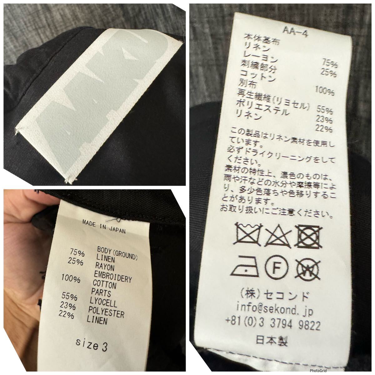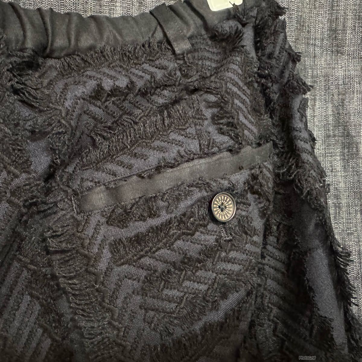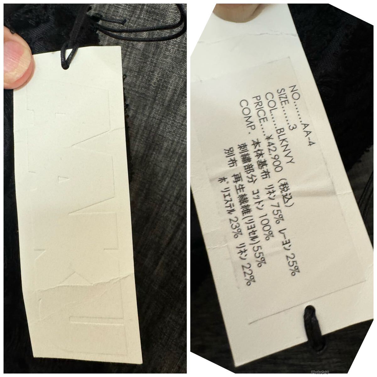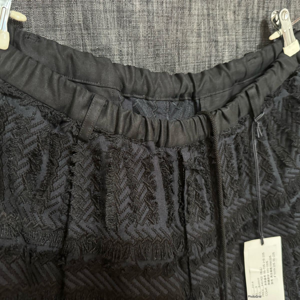 スピンクル(刺繍を2回かけることで立体的に作る)という手法にて、福井県で生産された刺繍生地を使用。フリンジ状になっている部分は全て手作業によってカットされています。工芸的な表情と、ネイビー×ブラックのカラーコントラストが◎