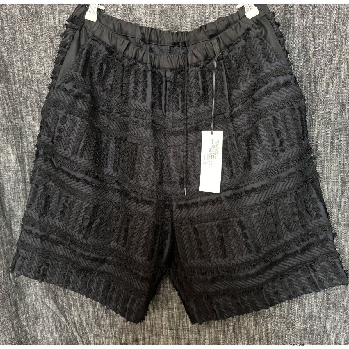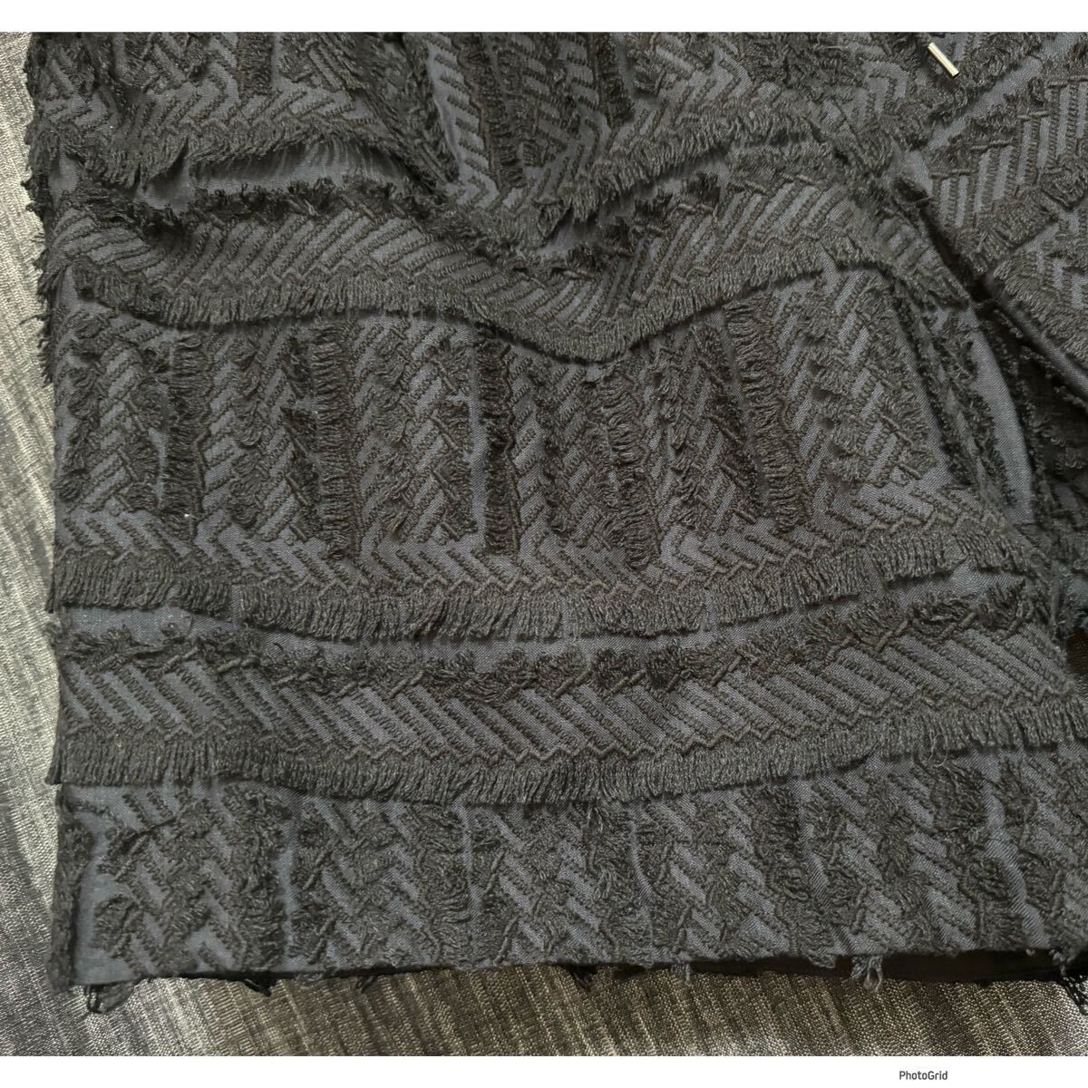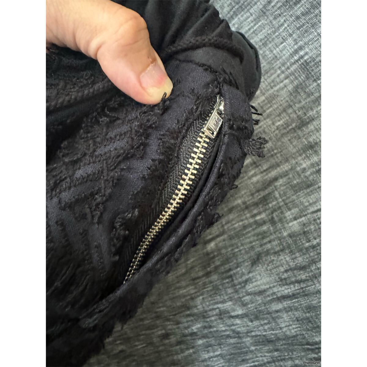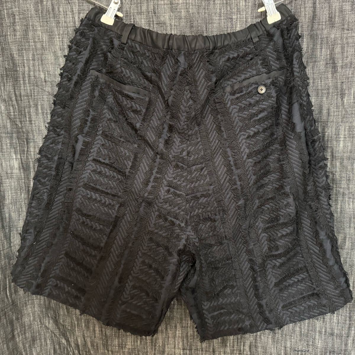 スピンクル(刺繍を2回かけることで立体的に作る)という手法にて、福井県で生産された刺繍生地を使用。フリンジ状になっている部分は全て手作業によってカットされています。工芸的な表情と、ネイビー×ブラックのカラーコントラストが◎