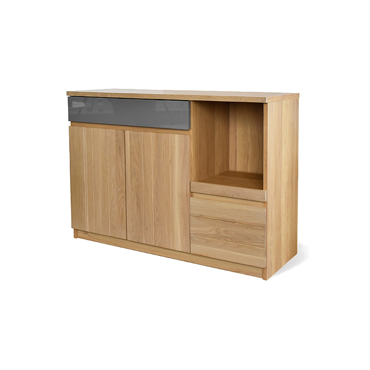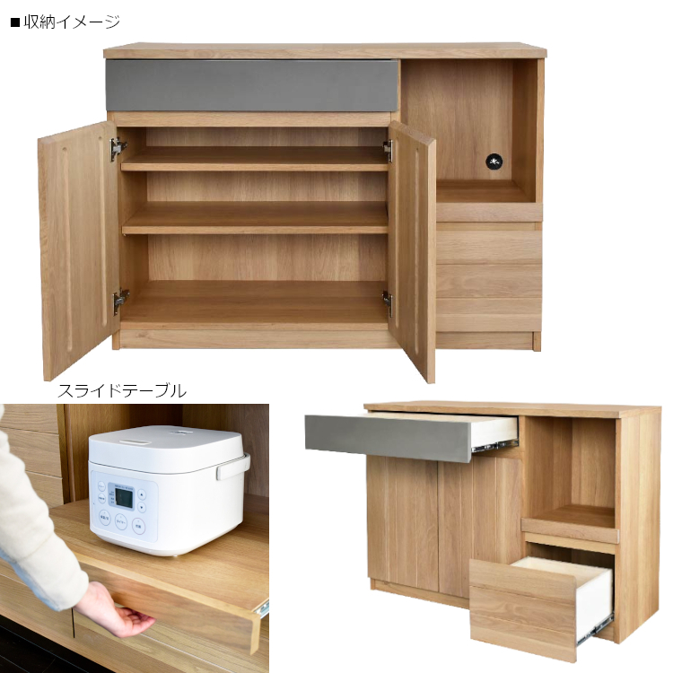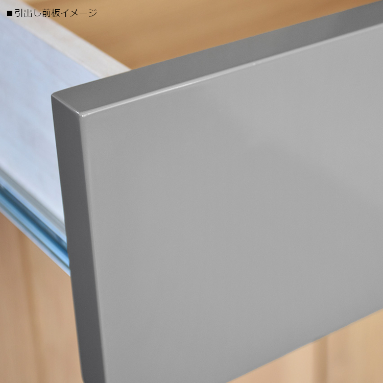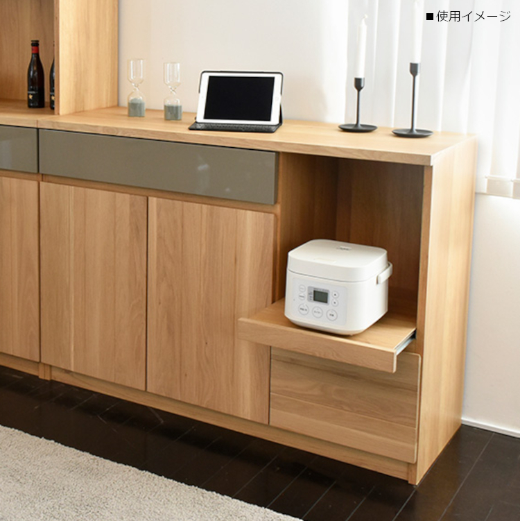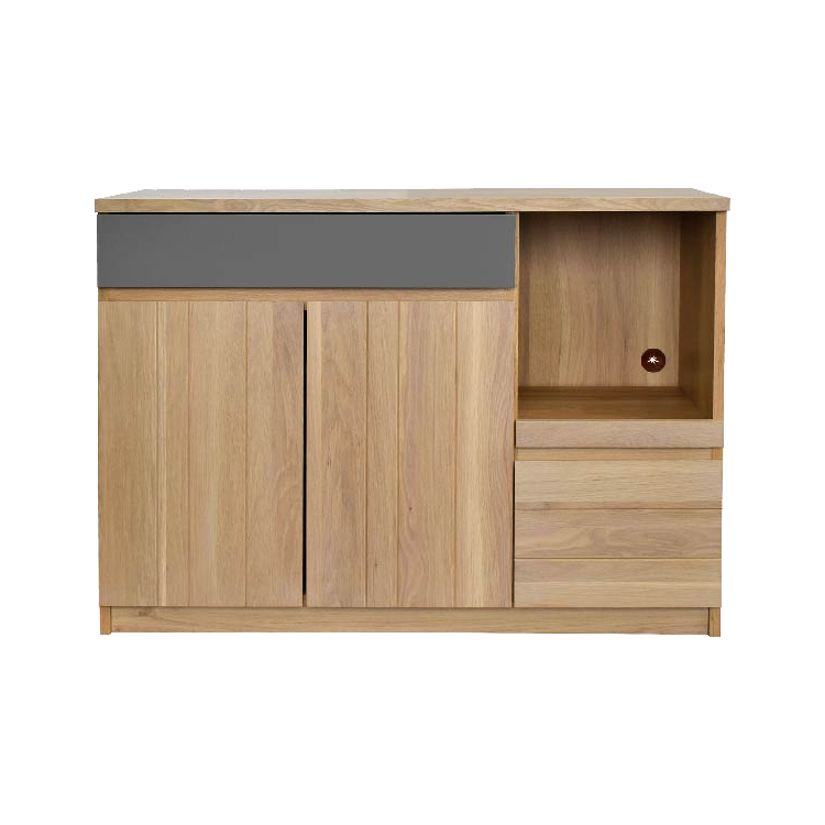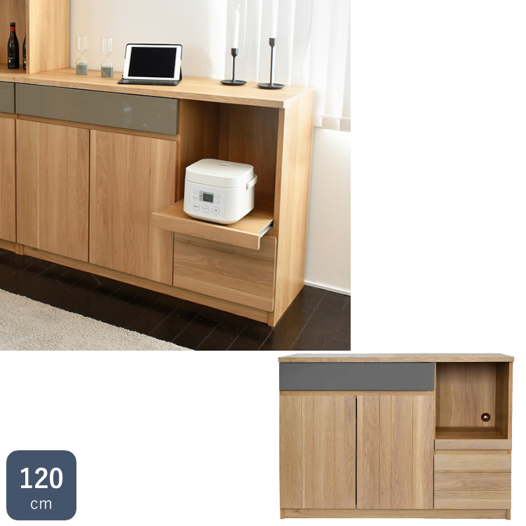 オークとグレーの前板のコントラストが美しい、シンプルなカウンターです。深さの異なる2杯の引出しと可動棚板2枚による棚収納で収納するものに合わせてフレキシブルに収納して頂けます。