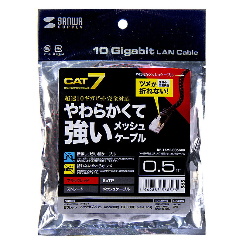 安心のツメ折れ防止コネクタと、丈夫で取り回しの良い細径メッシュ採用の10G対応CAT7LANケーブル。ブラック&レッド・0.5m。
