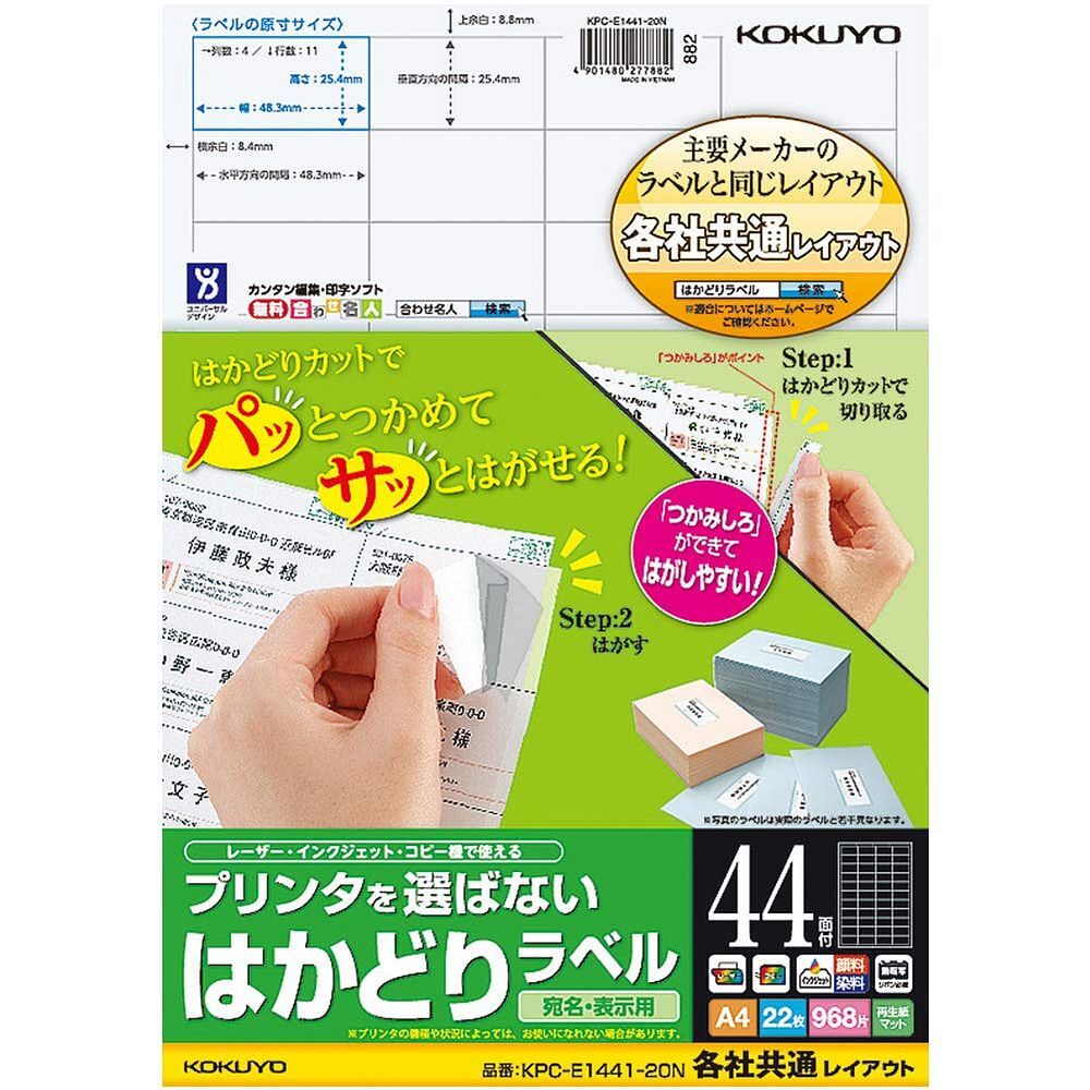 【商品名:(まとめ買い)コクヨ プリンタを選ばない はかどりラベル 各社共通レイアウト A4 44面 22枚 KPC-E1441-20N 〔3冊セット〕】
