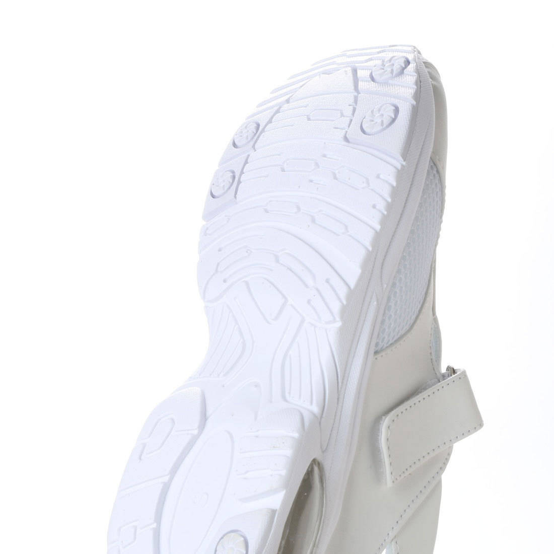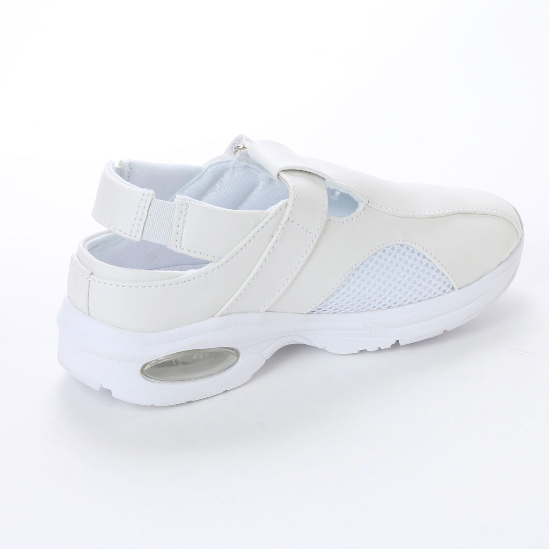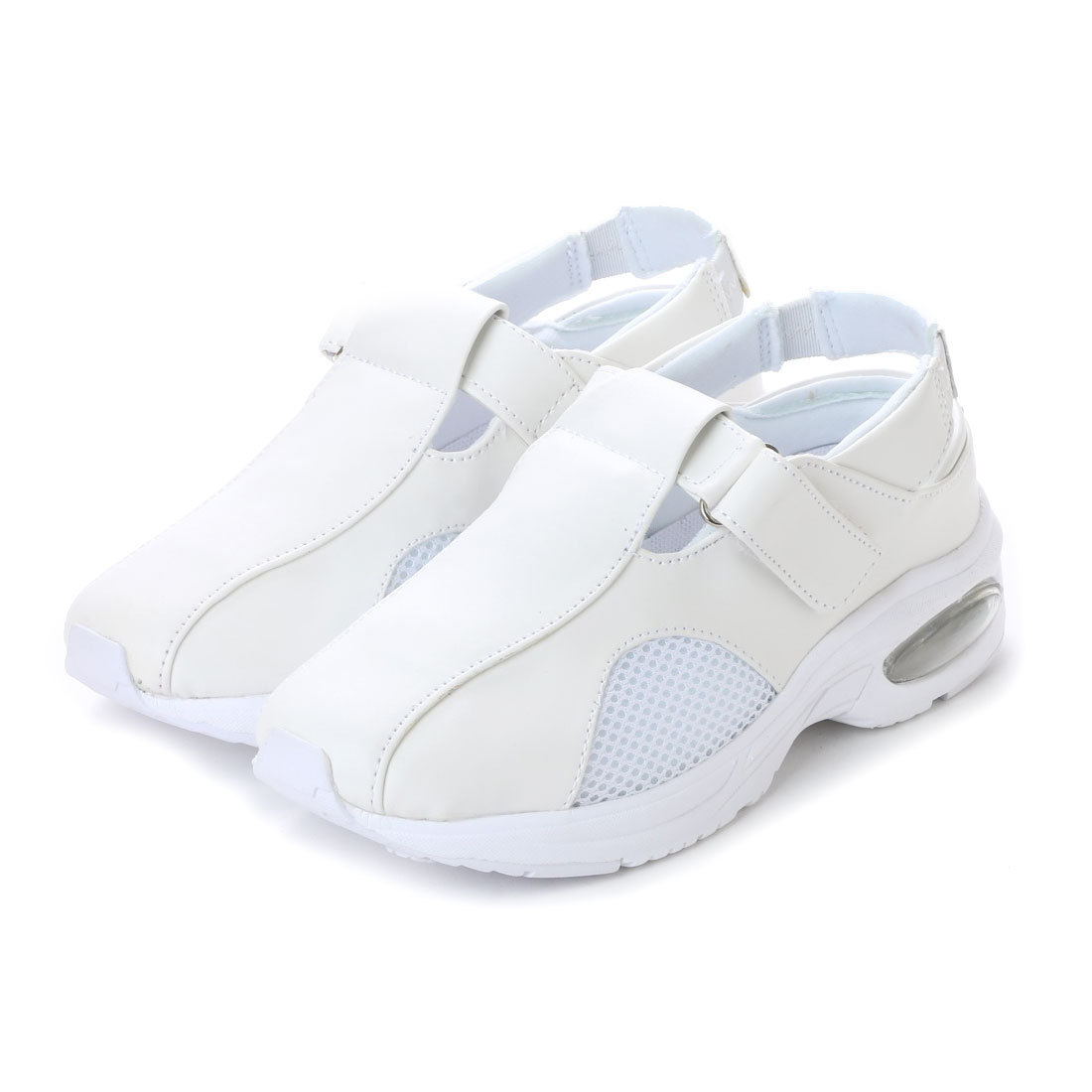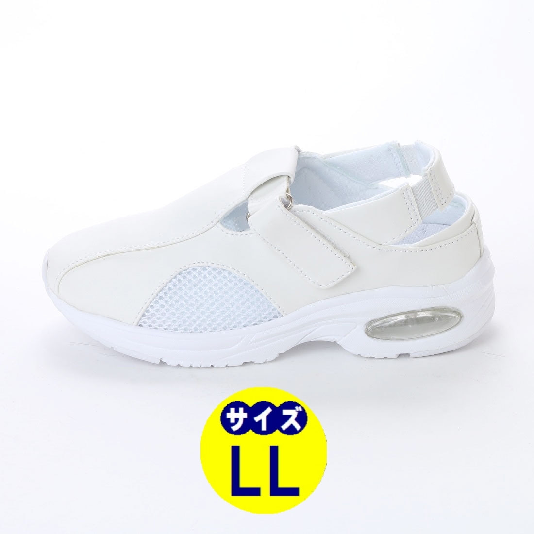 軽量&幅広、甲ベルトにベルクロ(マジックテープ)、踵の一部にゴムを使用、 足をしっかりホールドしてくれます。 甲の一部にメッシュを使用しており、靴の中が蒸れにくく快適。 エアクッション付きの靴底は軽量EVA素材+滑り止めゴム素材を使用、 疲れにくい軽量快適と防滑性を両立。 サイズ感: 普段サイズで合わせていただくと問題ないかと思われます。 23.5cmのお客様が難しいところで、ほとんどのお客様がMサイズで ちょうど良いと言われますが一部、小さかったと言われるお客様もおられました。 商品仕様 カラー:ホワイト サイズ:LLサイズ(24.5cm~25.0cm) 甲周り:3E 幅広 甲材:合成皮革・ナイロンメッシュ 底材:EVA・合成ゴム エアクッション付き 中敷:取り外せるカップインソール | |||