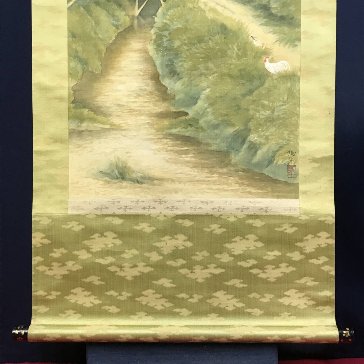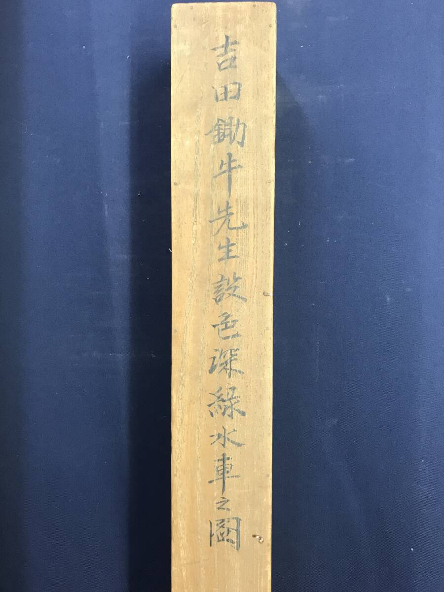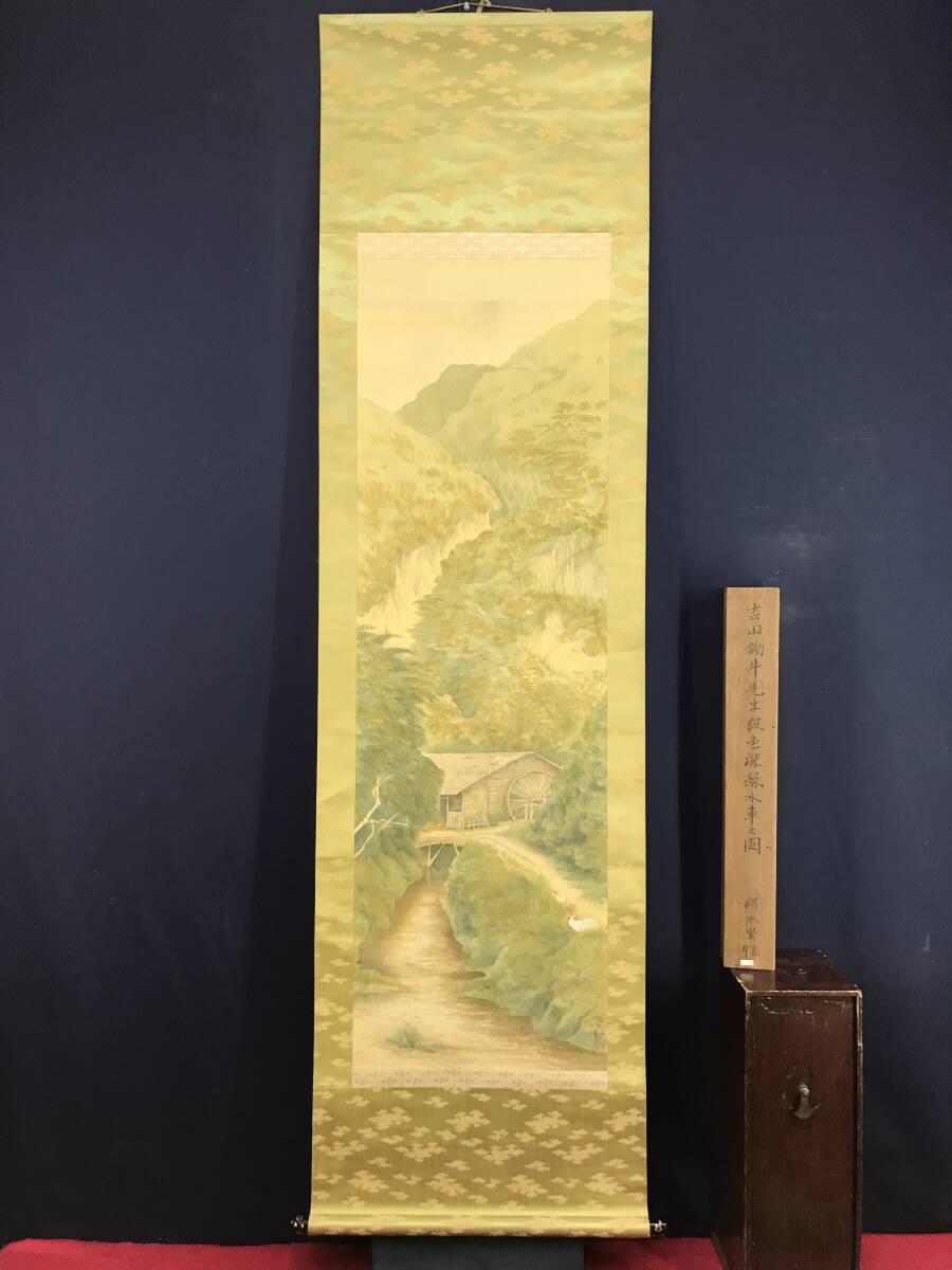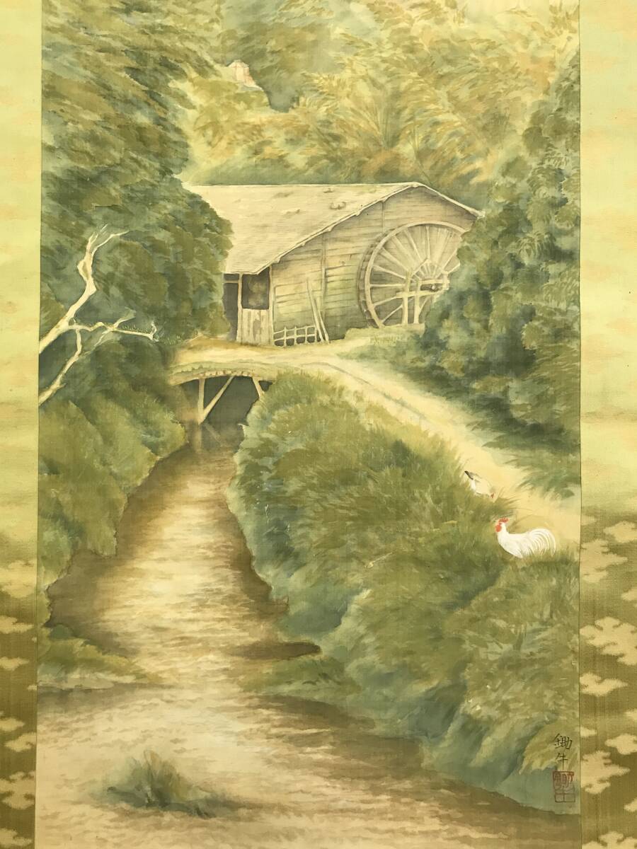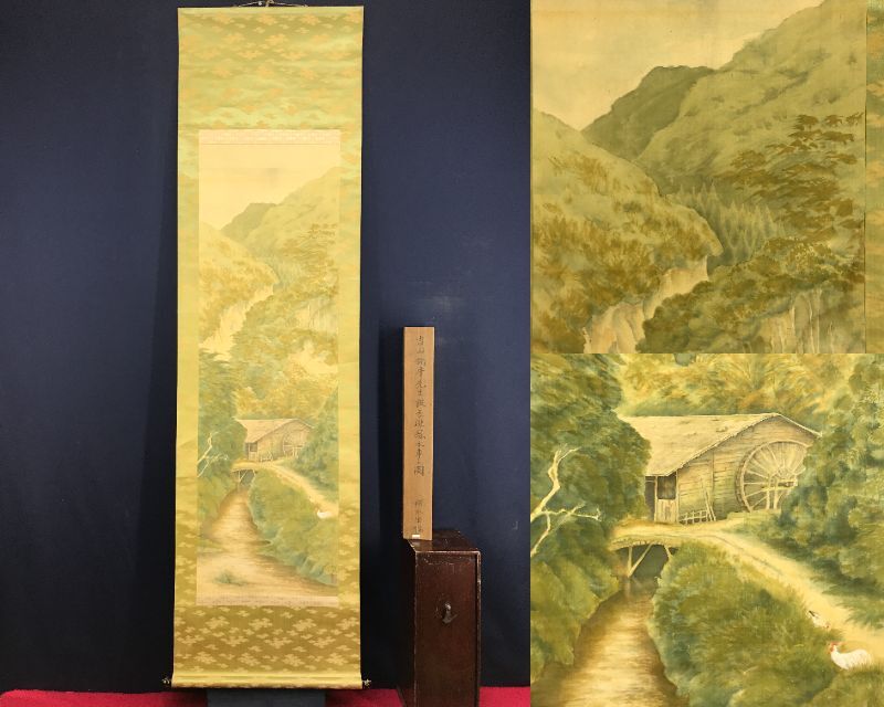 真作/吉田鋤牛/設色深緑水車之図/青緑山水/山水図/掛軸☆宝船☆AG-394