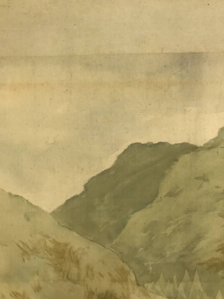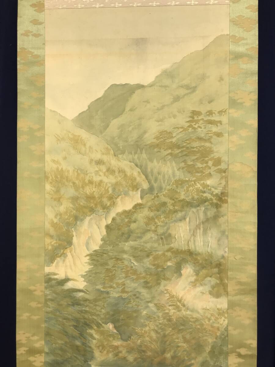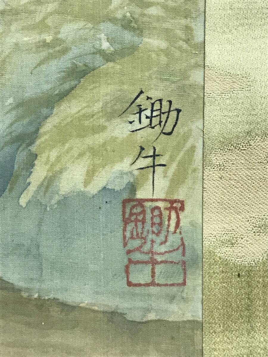 【作品状態】 本紙は絹本肉筆です。本紙は多少の薄汚れあります。表装は右側の柱に大きな水シミあります。