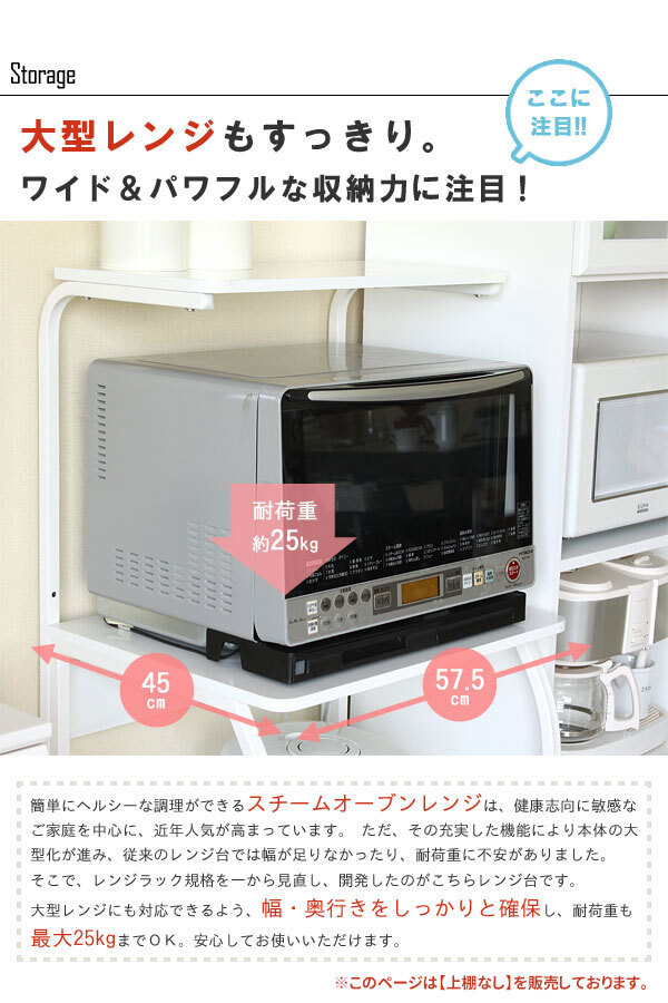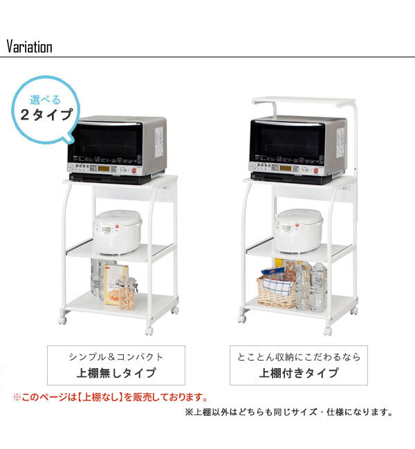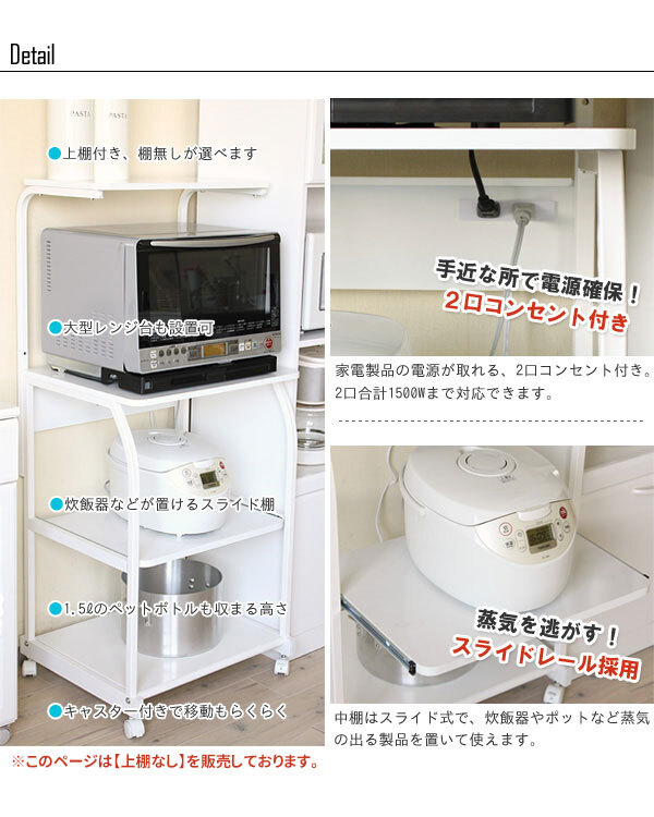 大型レンジに対応したワイド&パワフルなレンジラック。 全身ホワイトに統一された清潔感のある姿に、シンプルで使いやすいデザイン。 スライド棚にはポットや炊飯器などの家電製品も収納OK。 電源が手近で取れるように便利なコンセント付きです。 キャスターで簡単に移動できるので、移動や掃除もらくらく。 キッチンをすっきり美しく見せることができるでしょう。 |