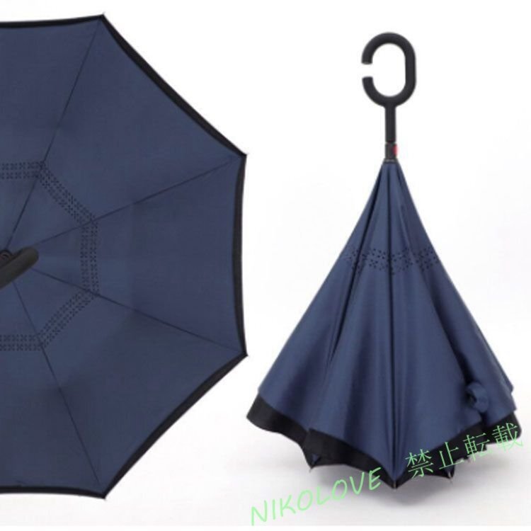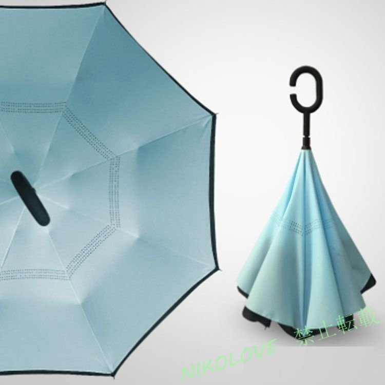まわりに迷惑をかけない!自分も濡れない便利な傘。傘が普通とは逆に開閉できることで、濡れるリスクを減らせます。狭いところでも開閉できる、自立式逆さ傘。両手がフリーになる設計、人間工学に基づいたC型ハンドル。人間工学に基づいて設計された持ち手はとても持ちやすく、片手でワンタッチ自動で開きます。雨の日もスマホの操作ができ、子供さんを抱っこしたりたくさん荷物を持つ事も可能。撥水コーティングを施し、高密度で防水効果には優れた効果があります。太陽からの直射日光や断熱効果も高い性能を誇ります。高密度生地2枚をレイヤーすることによって驚くべき防水効果と紫外線防止効果を実現。混んだ電車の中でも、洋服を濡らしません。