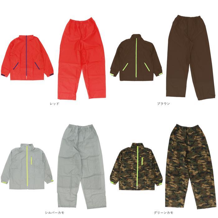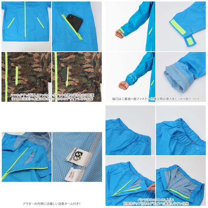 商品説明 | ・・こだわりの機能を取り揃えた「レインスーツ上下セット」が新登場! ・上着は首元のスナップボタンでフードの取り外しが可能。フード背面には反射テープ付き。 ・スマホがすっぽり入るファスナーポケットを腰の高さ左右に配置。(CAMO(迷彩)の上着は胸ポケットのみのデザインになります) ・袖口は二重袖+面ファスナー仕様で雨の侵入をしっかり防ぐつくり。 ・アウターの内側には嬉しい消臭ネーム付き! ・パンツはウエストゴム入り♪前開きジップ付きのデザインで着脱しやすい仕様。 ・ベルトループが付いているからお好みでベルト装着もできる。 ・裾口はスナップボタンで裾幅を調節可能。 ・上下ともに総裏メッシュ生地を採用。蒸れやベタ付きを緩和し快適なサラサラな着心地をキープ。 ・シンプルなシルエットに仕上げ男女ともに着用しやすいユニセックスデザイン。 |
