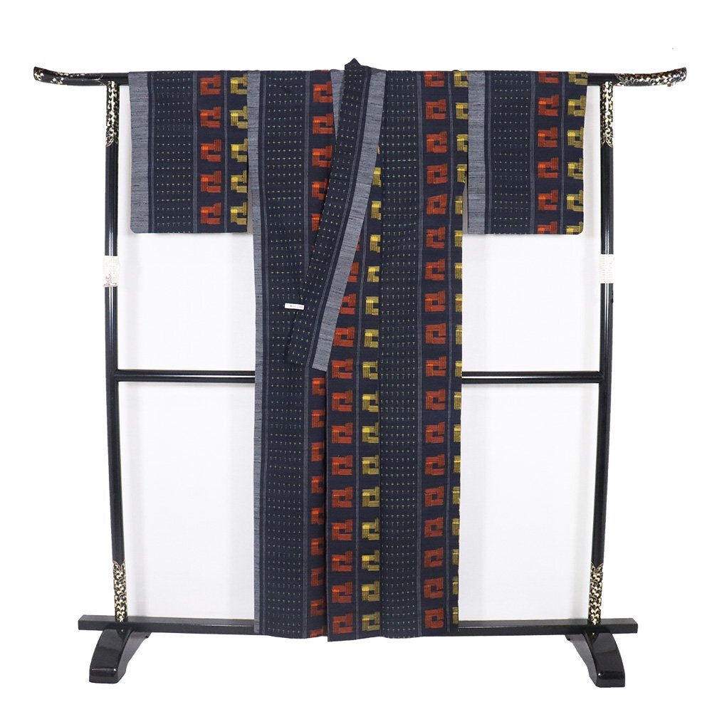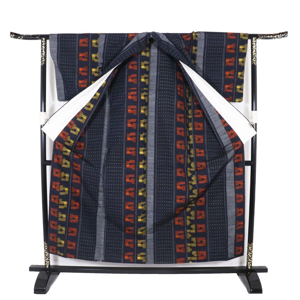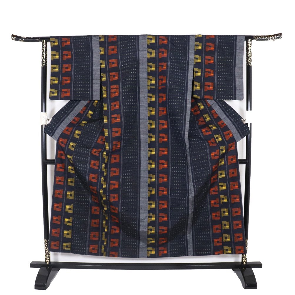 | 単衣 手織り紬 濃紺・グレー・赤・黄色地 絣柄織 161 広襟 |