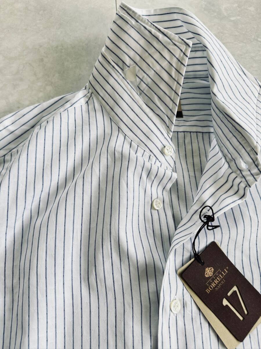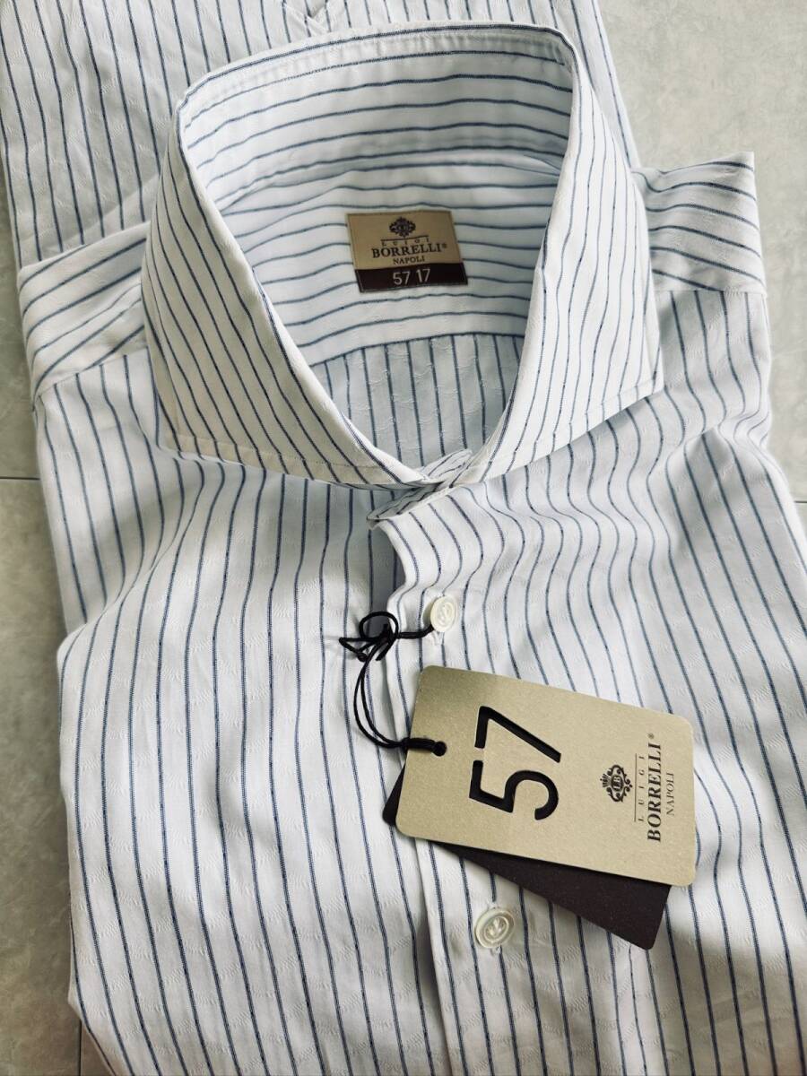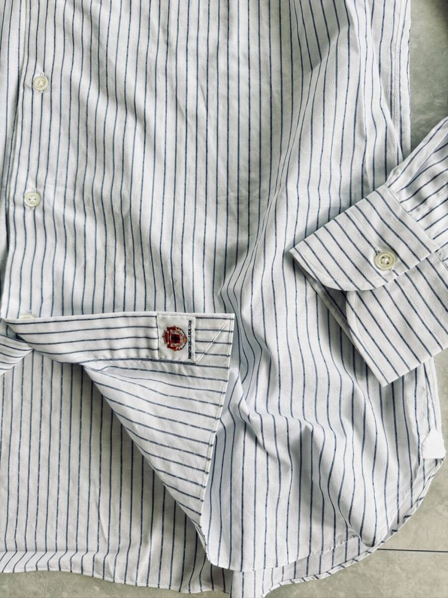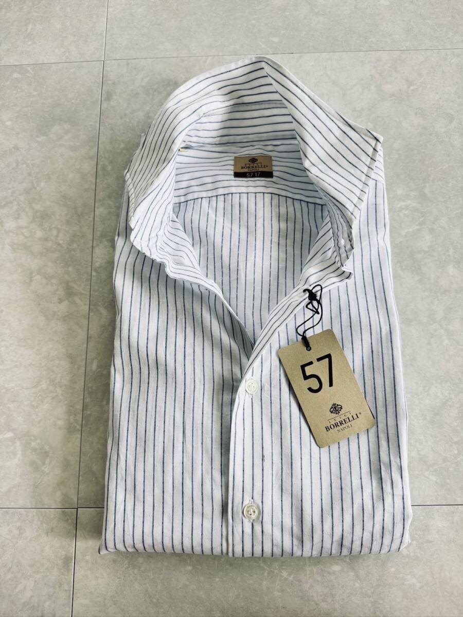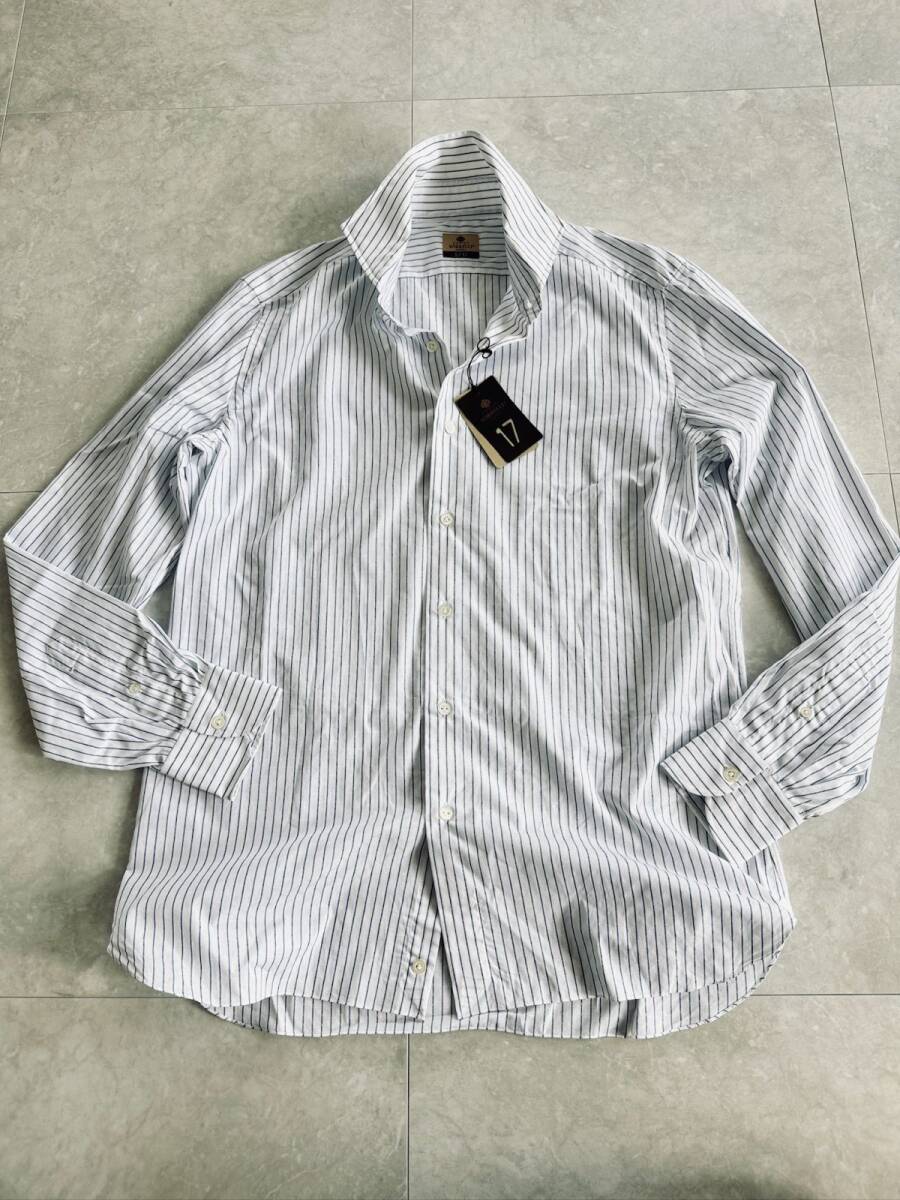 シャープさと色気が同居するホリゾンタルカラー「FELICE」 ご紹介するのは、新たにコレクションに加わった「FELICE(フェリーチェ)」です。 フェリーチェは、ドレスシャツ用の衿型として開発されたホリゾンタルカラーになります。 従来ボレッリのホリゾンタルカラーは、ドレス・カジュアル共通のNA35が主流でしたが、 ドレスシャツにしては衿腰が若干低いという理由からフェリーチェが開発されました。 衿羽根が水平に近い角度で開くホリゾンタルカラーのお手本とも言える衿型なのですが、 やわらかめの衿芯(フラシ芯)が使用されているため衿羽根に自然なふくらみが生まれます。 上から見ると衿羽根は直線ですが、正面から見ると衿羽根が美しいカーブを描いていることが 分かると思います。 このカーブが、ナポリシャツらしい独特な色気を生み出す要因になっています。 衿腰が高くなったぶん衿羽根に角度がつき、シャープさが増していることもポイントです。 ノーネクタイでボタンを外してもお洒落に決まるのでジャケパンスタイルにも使えます。 品名 :LUIGI BORRELLI / ルイジボレッリ 素材:綿100% 表記サイズ :41 着丈:78cm 袖丈:66cm 肩幅:45cm 身幅:58cm ※実寸値となりますが誤差はご了承ください。 ※迅速なお取引を心がけさせていただいております。オークション終了より24時間以内にご連絡をいただけない場合、土日祝日を除き48時間以内にお支払い手続きをいただけない場合は、お取引の意思なしと判断させていただき取引キャンセルとさせていただきます。 万が一上記が不可の場合は事前にご連絡いただくか、入札をお控えいただきますようお願い申し上げます。 ※なるべく現物に近いお色味で撮影するよう心掛けておりますが、閲覧環境の違い等によって違いが出る場合があります。 差し替えトラブルを避ける意味でも上述した旨含め、イメージと違う等での返品は受け付けておりません。 百貨店並みのサービスを求める方や神経質な方の入札はお控えいただきますようお願い申し上げます。 また、差替えやSNS使用後の返品等を防止するためためにも、原則返品には応じられません。 疑問点や心配事等がある場合は入札前に質問欄にてお問い合わせください。 ※当方が出品するすべての商品は間違いなく本物ブランド品となりますので、安心してオークションにご参加ください。 万が一、第三者等により偽物と判断された場合、商品の返品、お支払いただきました全額を返金をいたします。 |