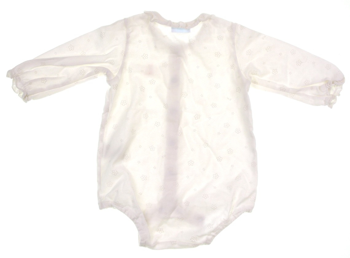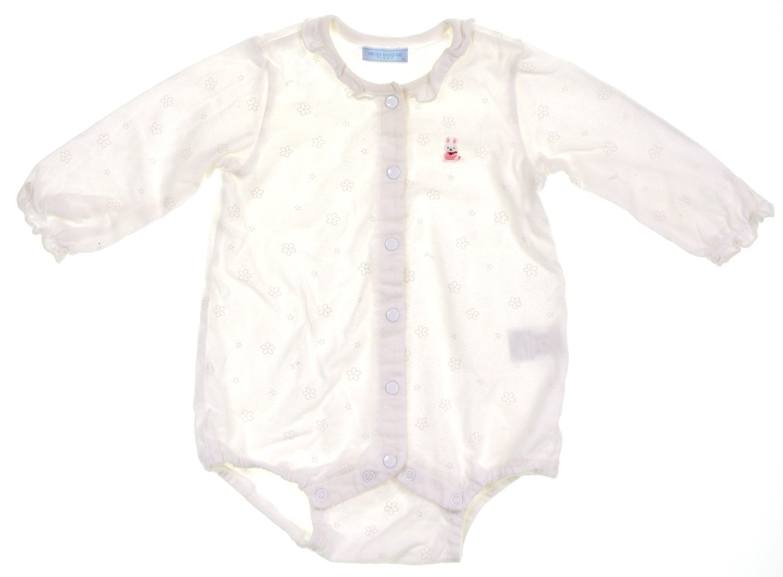 綿カットソー地です。全体に薄い色で花柄が入っています。やや毛羽立ちがあり、襟元に黄ばみがあります。たくさん必要なベビーサイズ、洗い替え用にいかがでしょうか?