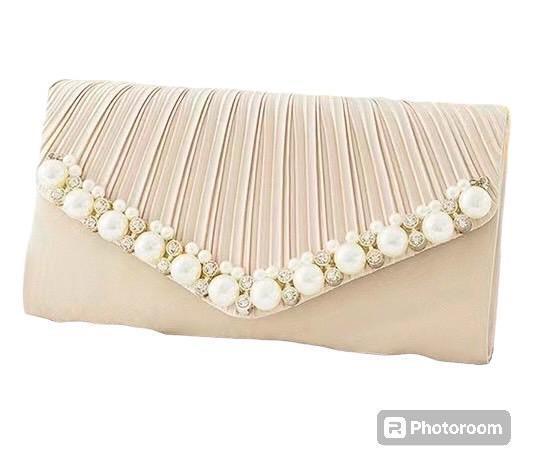 【プリーツ加工・存在感のあるパール】プリーツ加工の大きめパールが特徴的。ラインストーンを散りばめたエレガントなパーティーバッグ。使いやすく清楚で上品な印象を与えてくれます。