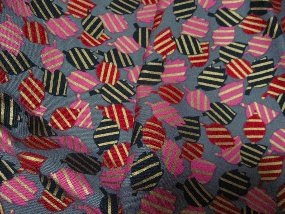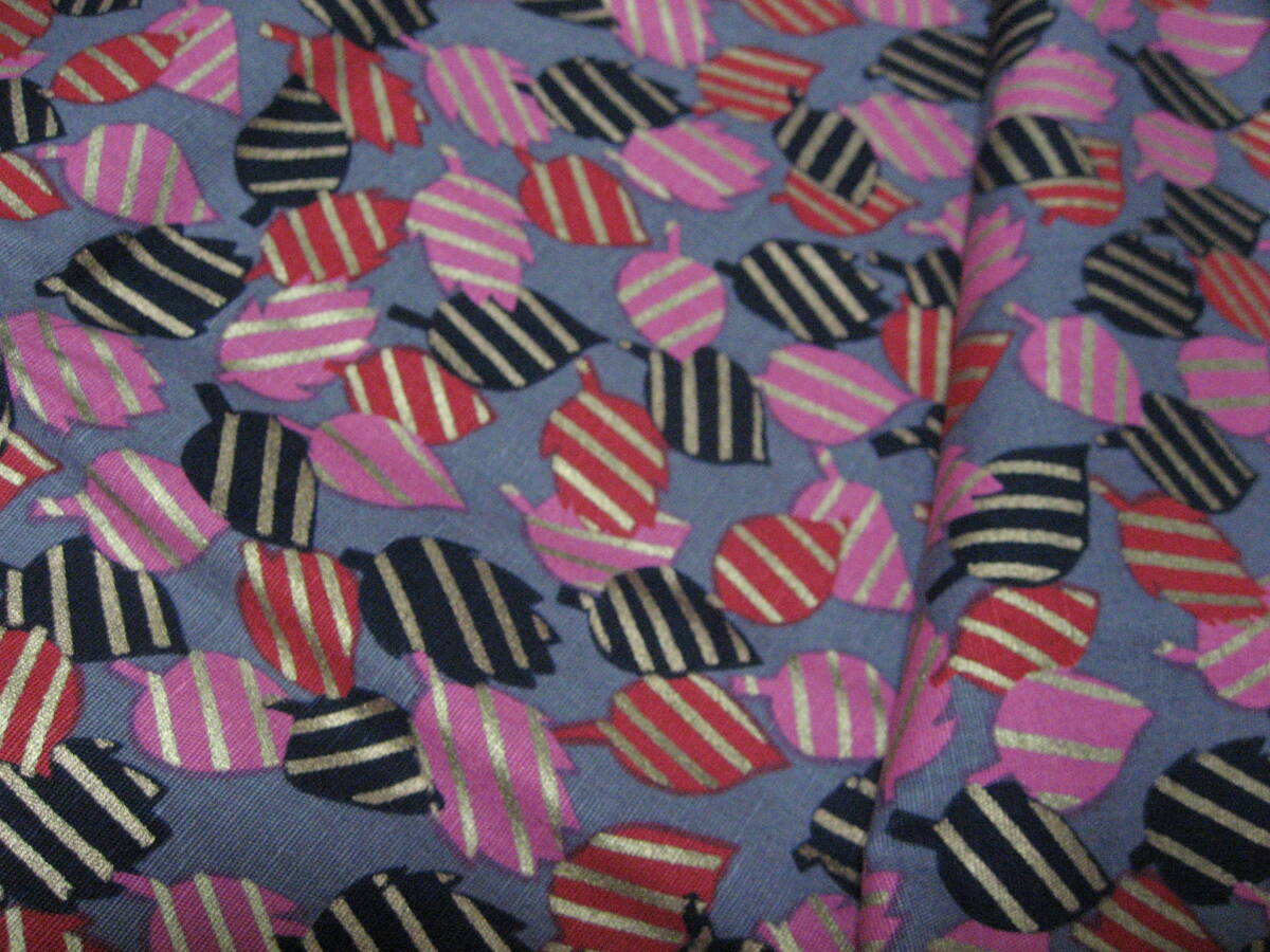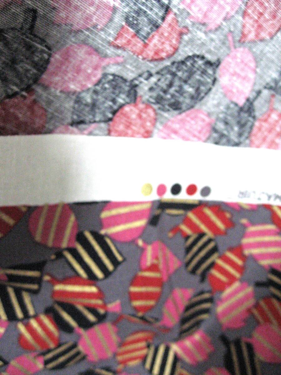 グレー地に黒、赤、ピンク、金色の木の葉の柄です。写真との色の誤差はご了承ください。