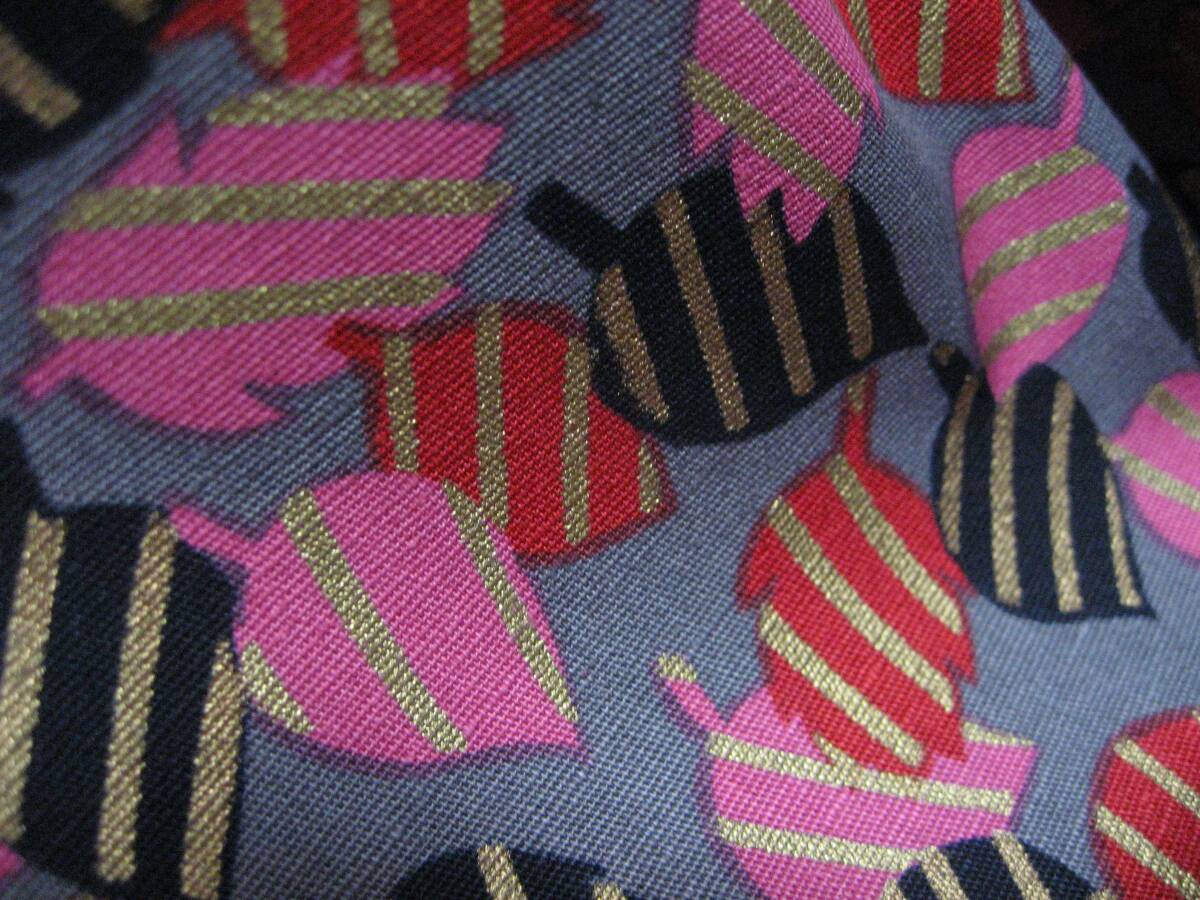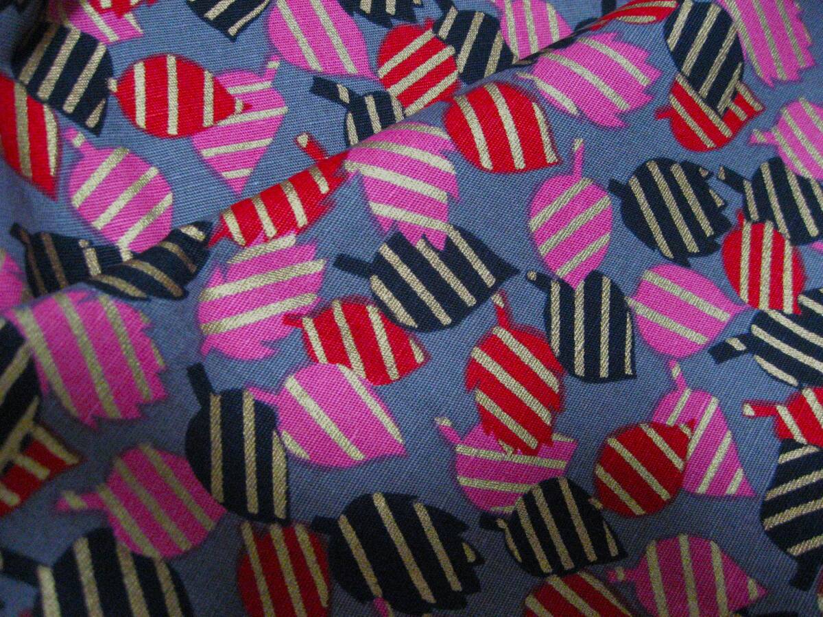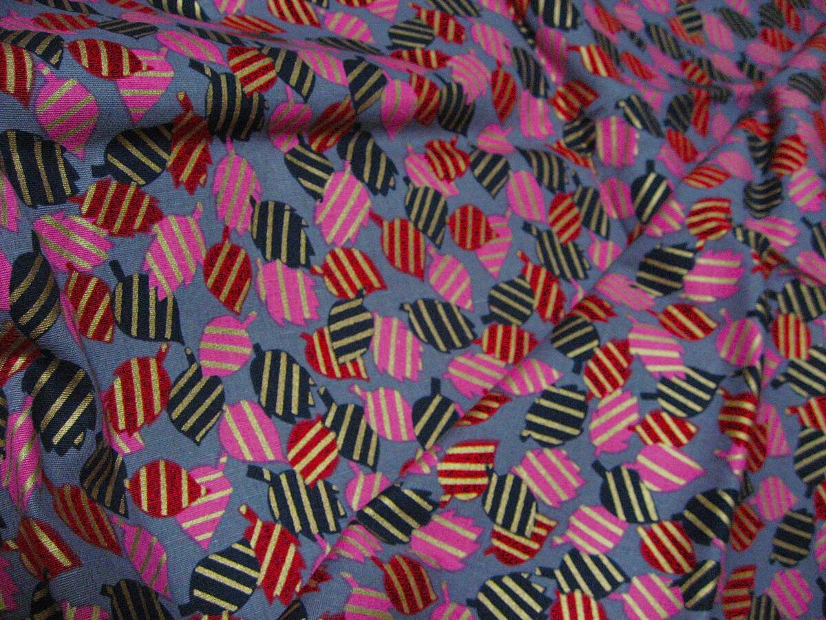 グレー地に黒、赤、ピンク、金色の木の葉の柄です。写真との色の誤差はご了承ください。