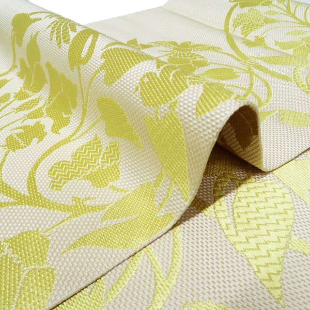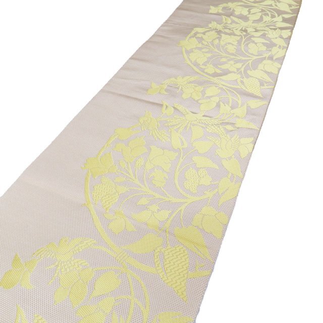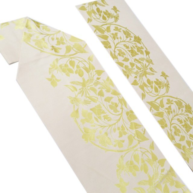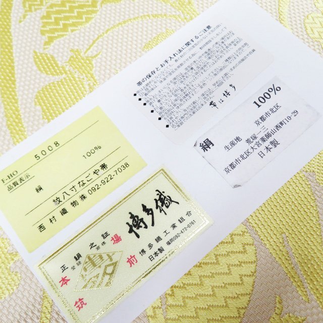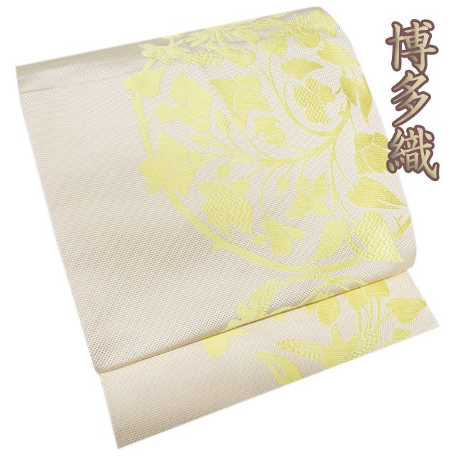 サイズ 371.5cm x 31cm 素材 正絹 商品ランク B ●お色 鳥の子色 淡黄色 経済産業大臣指定伝統的工芸品である福岡の博多地区の特産絹織物、【博多織】。 緯に太い糸を強く打ち込むため地合いがしっかりしており、博多帯を締めるとき特有のキュッ、キュッという衣ずれの音を発するのが特徴です。 粋な着物姿を演出するのにぴったりな逸品、是非この機会にお買い求め下さいませ。 使用感の少ない、美しいお品物です。 松葉仕立てのお品物です。 一部商品は実店舗・他サイトでも並行して販売しておりますので売り切れの際はご了承ください。 その他多数販売中 o | ||||||