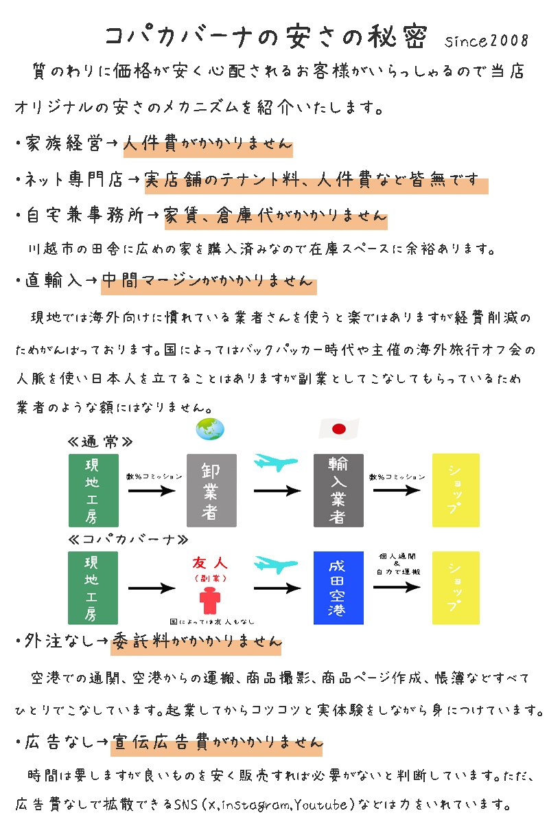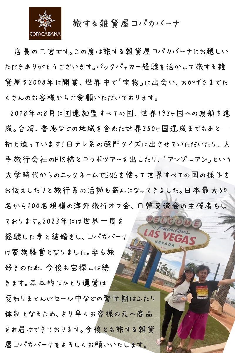 ・明細書&領収書  取引ナビから発行してください。当店では二重発行を防ぐため発行できません。 ・長期休業  当店は海外買い付けのため、長期休業が年に数回ございます。期間によっては開店したままで帰国後に発送の場合もございます。ヤフオクにはカレンダー機能がないため、コパカバーナYahoo!ショッピング店にてご確認ください。