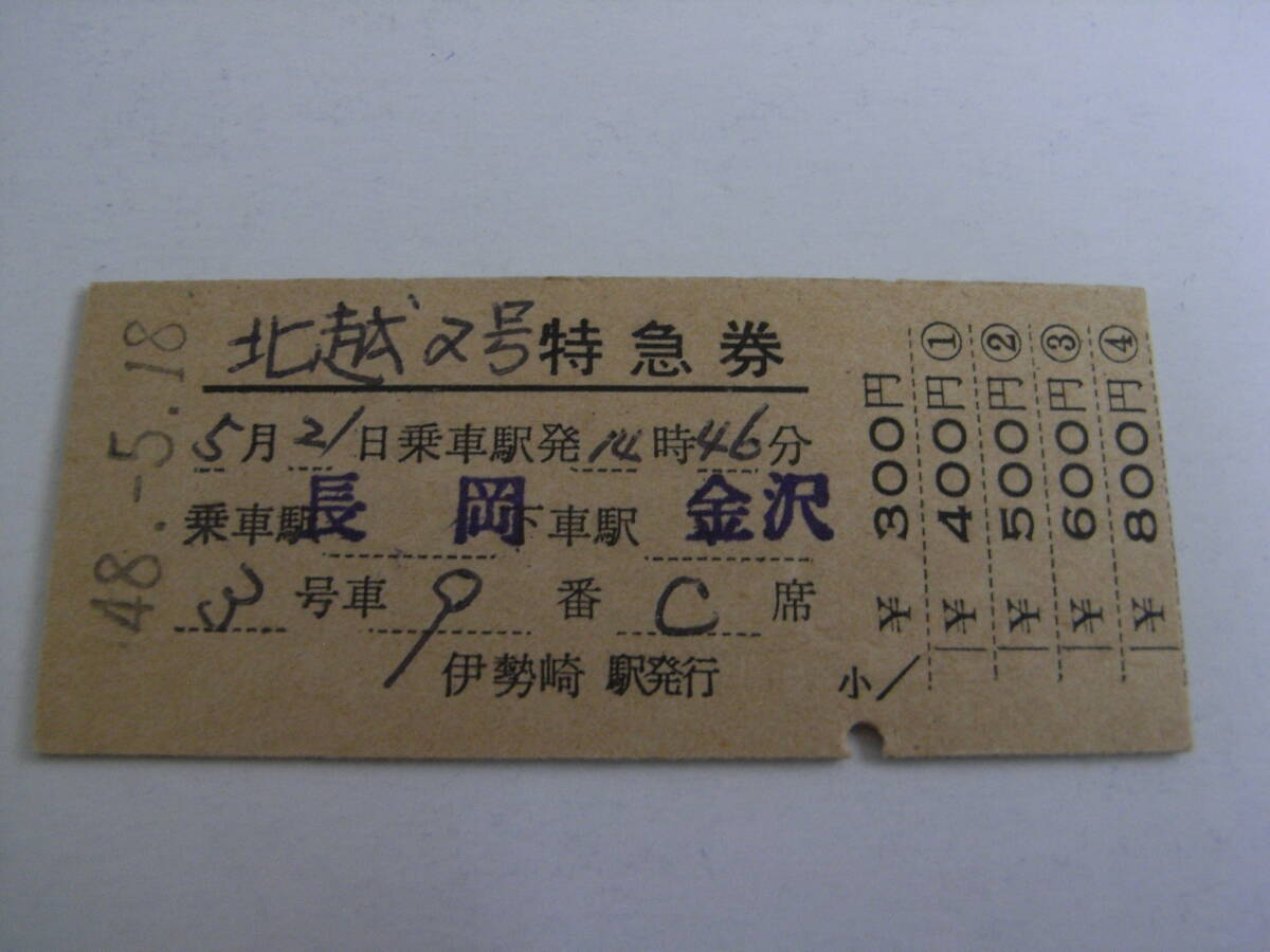 北越2号 特急券 乗車駅 長岡 下車駅 金沢 昭和48年5月18日発行 伊勢崎駅発行