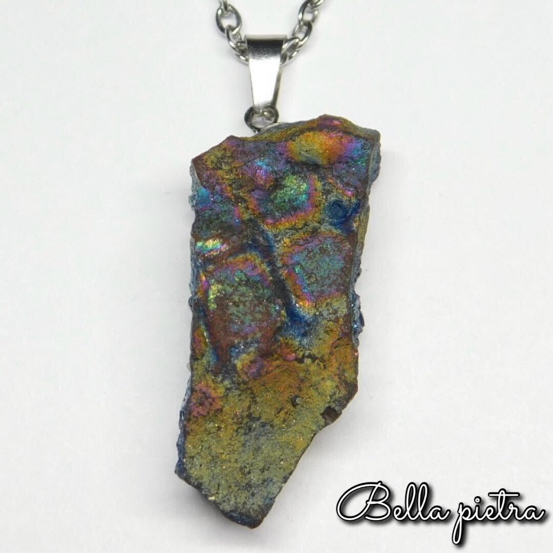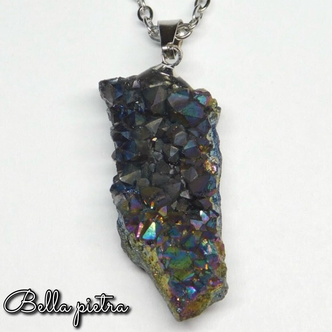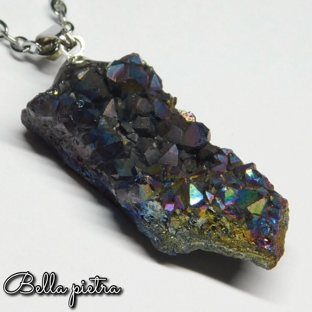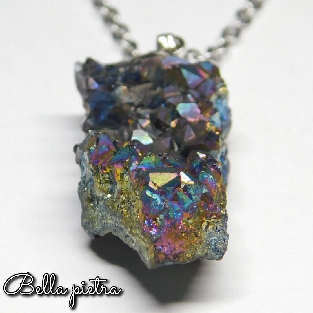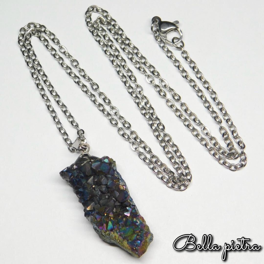 ドゥルージー・カルセドニーは、きめ細やかな結晶が重なり合っているカルセドニーにチタニウムコーティング(チタン加工)が施されています(^^) 光に当たることによってメタリックに輝き、まるで夢の中から抜け出したような幻想的な美しさです♪ また、持つ人の創造性や想像力を刺激し、内面の美を引き出す力があるとも言われています。 ポジティブなエネルギーを増幅させる効果があるともされ、人生において前向きな変化を求める人にとって、強力なサポートとなるでしょう。 【石言葉】 創造、癒し、保護、調和、美 ★ヒーリング効果★ ドゥルージー・カルセドニー ☆心の平和をもたらす ☆創造力を刺激する ☆ポジティブエネルギーを高める ☆精神的なバランスを整える ☆ストレスを軽減する ☆自信を向上させる ☆決断力を強化する ☆愛情を深める ☆集中力を増す ★size★ 縦:約3.8cm(バチカンを含む) 横:約1.3cm 厚み:約1cm チェーン:約54.5cm ★素材★ 合金(チェーン) ★重さ★ 8g | ||