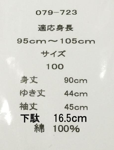| サイズ | ■浴衣 サイズ 100 身丈約90cm 袖丈約44cm 裄丈約45cm 適合身長95cm~105cm(3~4才) ※こちらの商品は、あらかじめ肩上げ腰上げがとられている商品です。 ※身丈は着付け(おはしょりなど)で調整できます。 ■下駄 下駄サイズ:約16.5cm(フリーサイズ) ※適合足サイズ15cm~17cm |