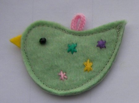 うぐいす色に小花の刺繍のある可愛い小鳥のネームタグ♪