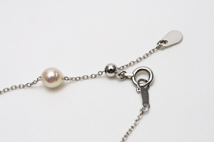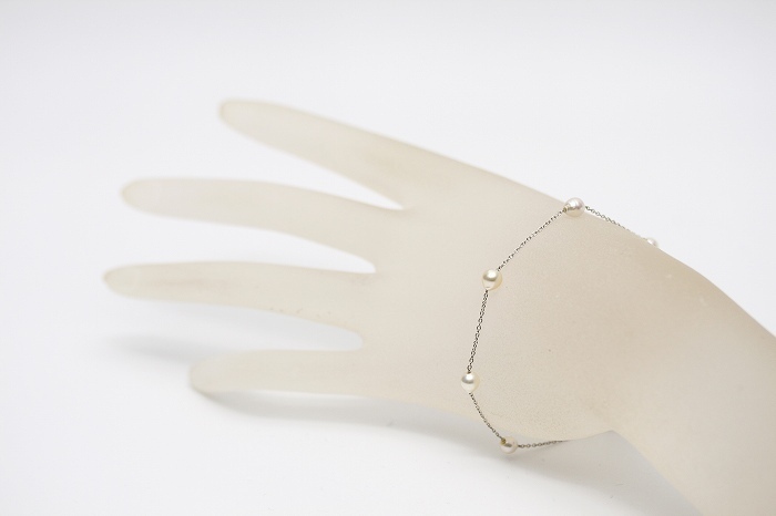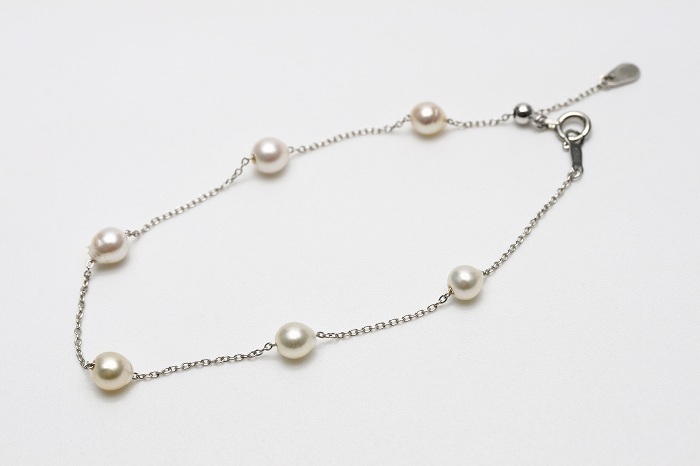 アコヤパールK18WG製チェーンブレスレットです。 ホワイトカラーのパールが軽やかに煌めくデザインで,チェーンもキラキラして綺麗です。 アジャスタータイプで長さ調整も可能です。 | |