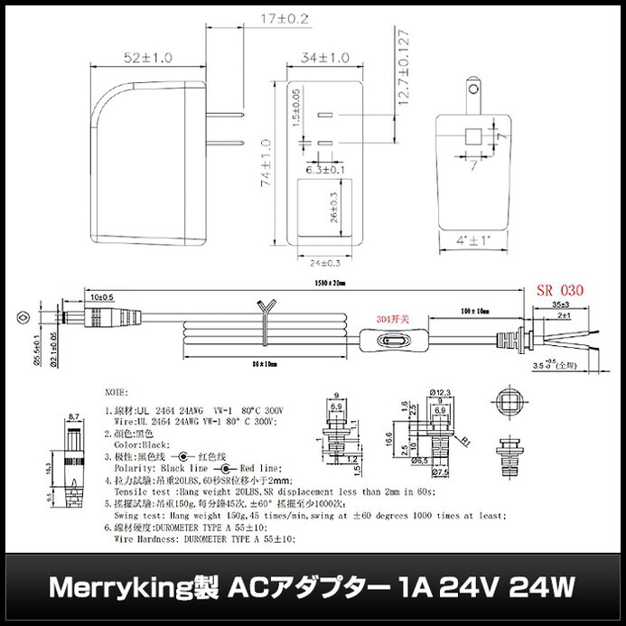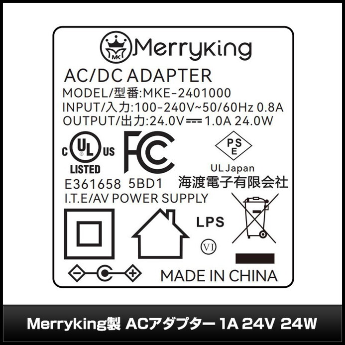 | サイズ:約74.0×52.0×34.0mm(奥行/幅/高さ) ケーブル長(出力):約1.5m スイッチサイズ:61.5×19.1×20.5mm 本体より約10cmの位置 DCジャック外径:5.5mmφ DCジャック内径:2.1mmφ 分類:スイッチングACアダプター 型番:MKE-2401000 出力電圧:24V 出力電流:1A 消費電力:24W メーカー:Merryking(メリーキング) 入力端子:差込プラグ 出力端子:DCジャック ジャックタイプ:ストレート 定格入力電圧:AC100~240V 入力周波数:50/60Hz 極性:センタープラス DCコード規格:AWG24/300V/80℃ 重量(本体):約141g 本体より約10cmの位置に「ON/OFFスイッチ」がついているモデルです。 通電が不要な際は、コンセントから抜かなくとも、ボタンによる操作のみで電源のオン・オフが可能です。 スイッチは、別売りのON/OFFスイッチよりも小さいためよりコンパクトな配線をする際に向いています。 保証:商品到着後、1年間の品質保証が付いております。 万が一品質に問題があった場合は、メールにてご連絡ください。 | |