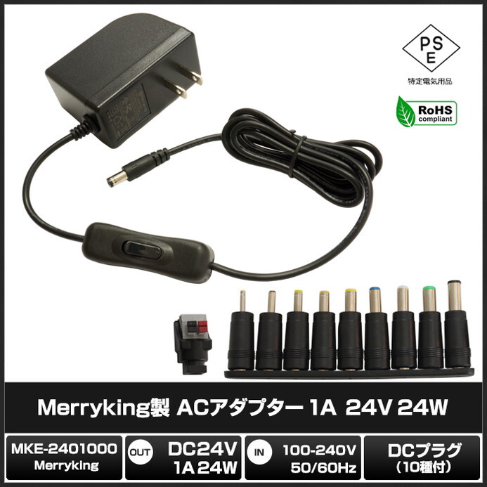 | ACアダプター 汎用電源 24V 1A 24W スイッチ付き 10種セット 5.5mm 2.1mm PSE認証 1年保証 | 1セット |
