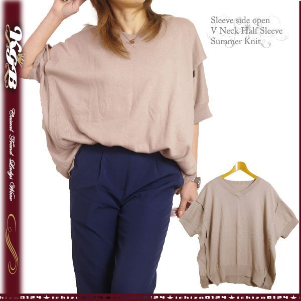 ★袖にスリットの入った5分袖のVネックサマーニット。