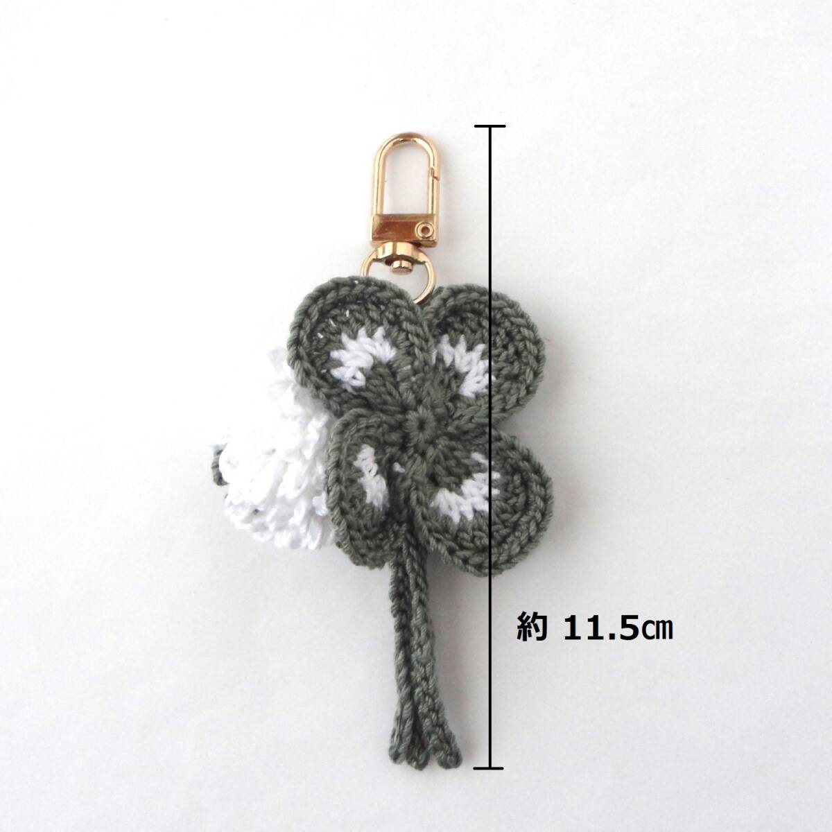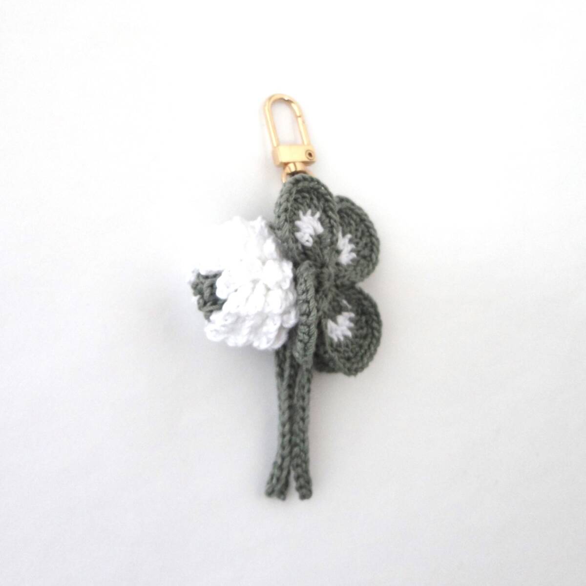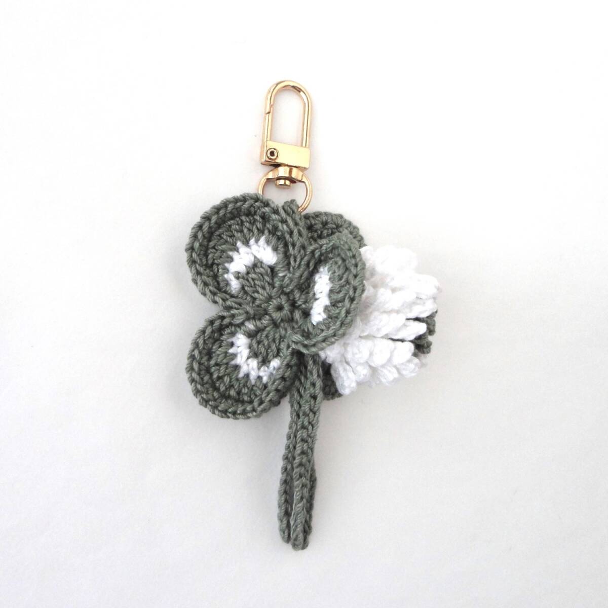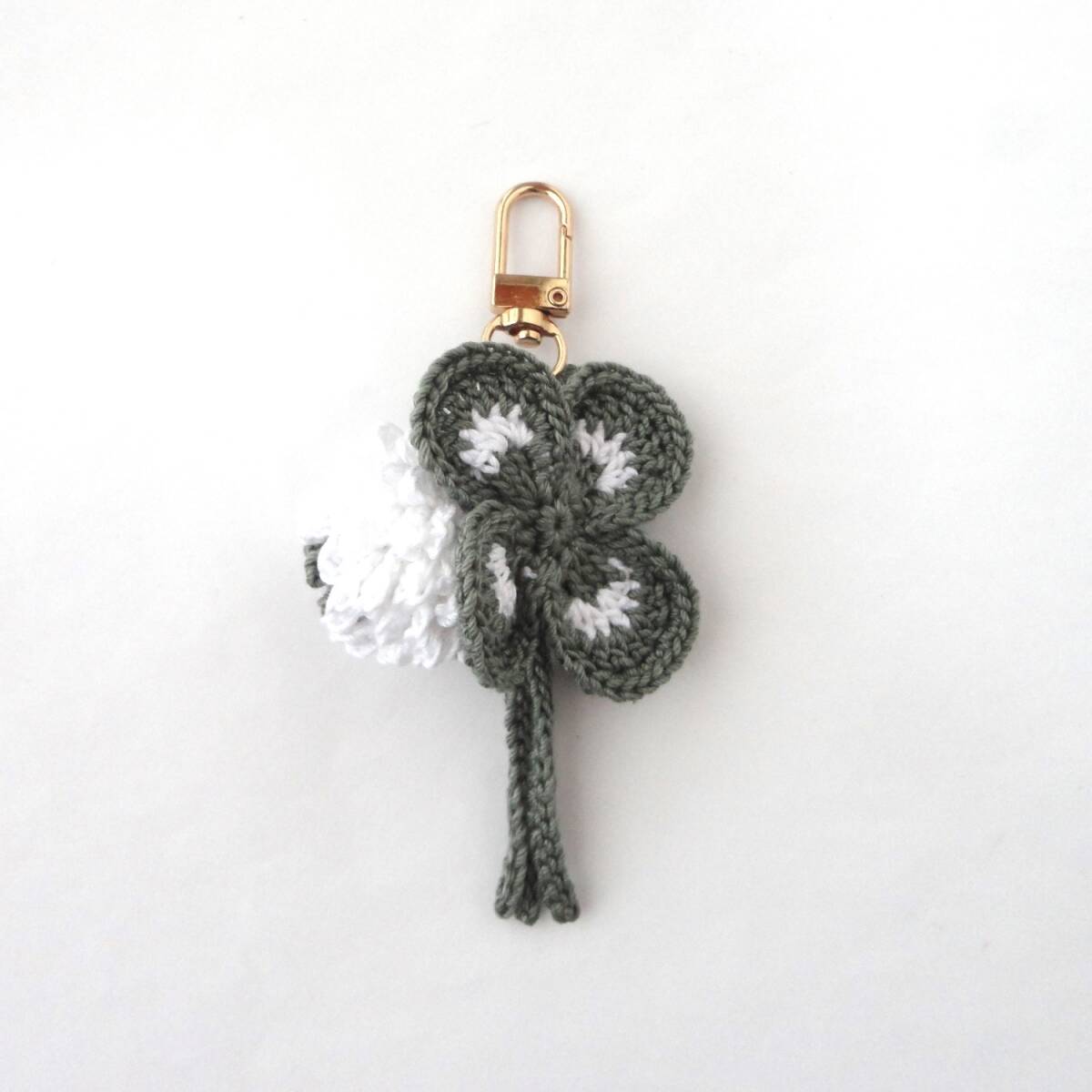 立体感がゴージャスなシロツメクサとクローバーのバッグチャーム*キーホルダー*PGR*レース編み*ハンドメイド*b588∴再販×4∴