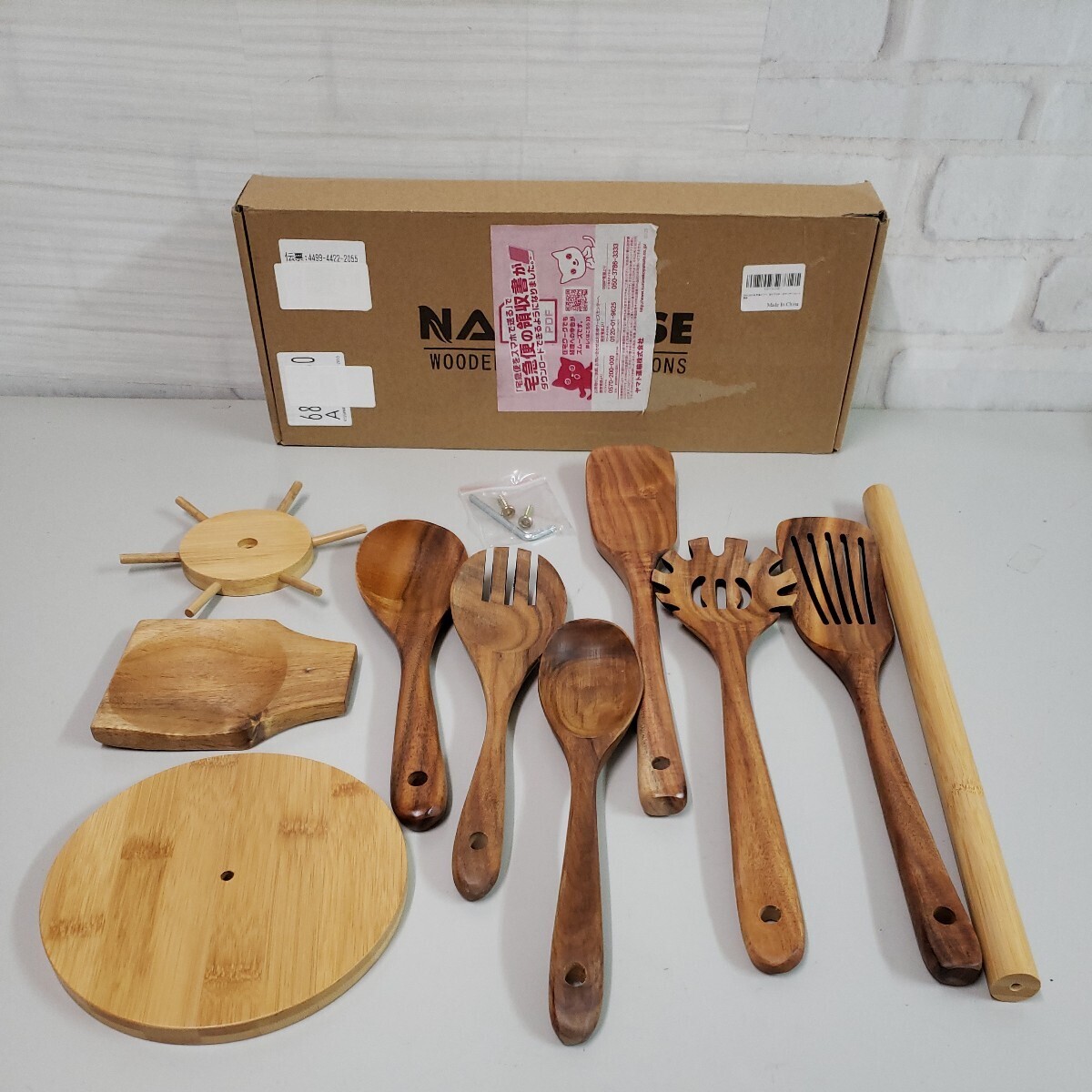 NAYAHOSE 木製スプーン 料理用 8本 木製調理器具セット キッチン用 天然チーク材 ノンスティック調理スプーン 竹ホルダー付き キッチン吊り下げオーガナイザーセット
