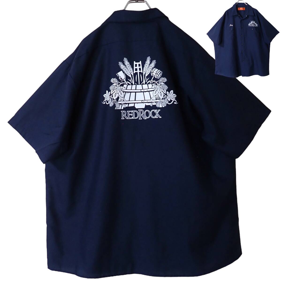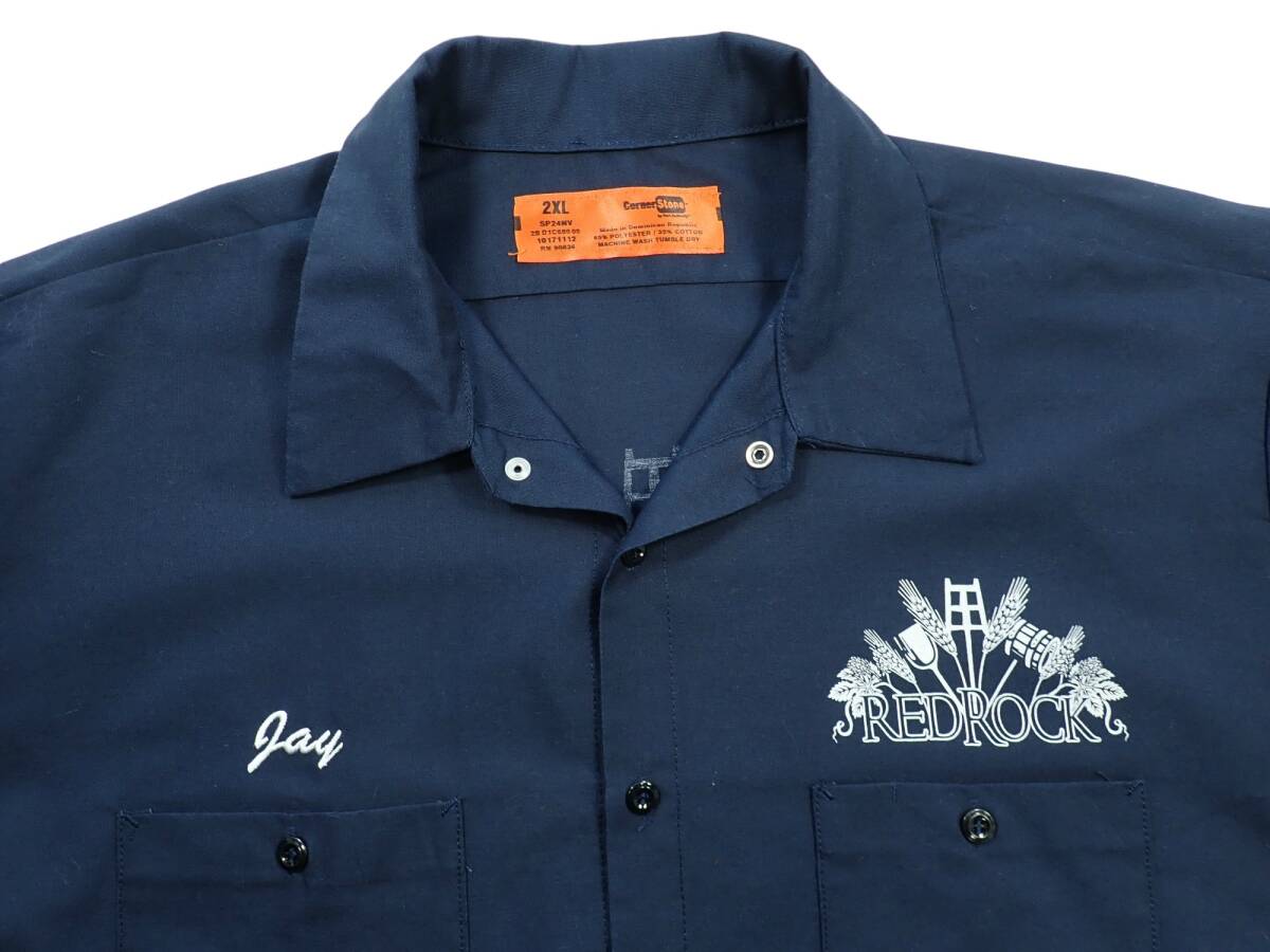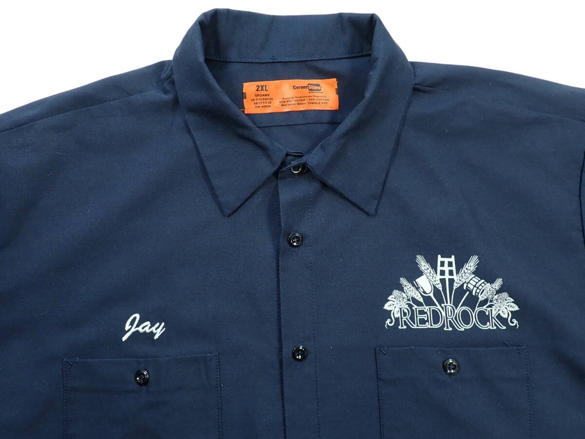 備考 CornerStoneのやや薄手の生地にフロントに刺繍、プリントバックにプリント施された半袖ワークシャツです。クリーニング、プレス済。