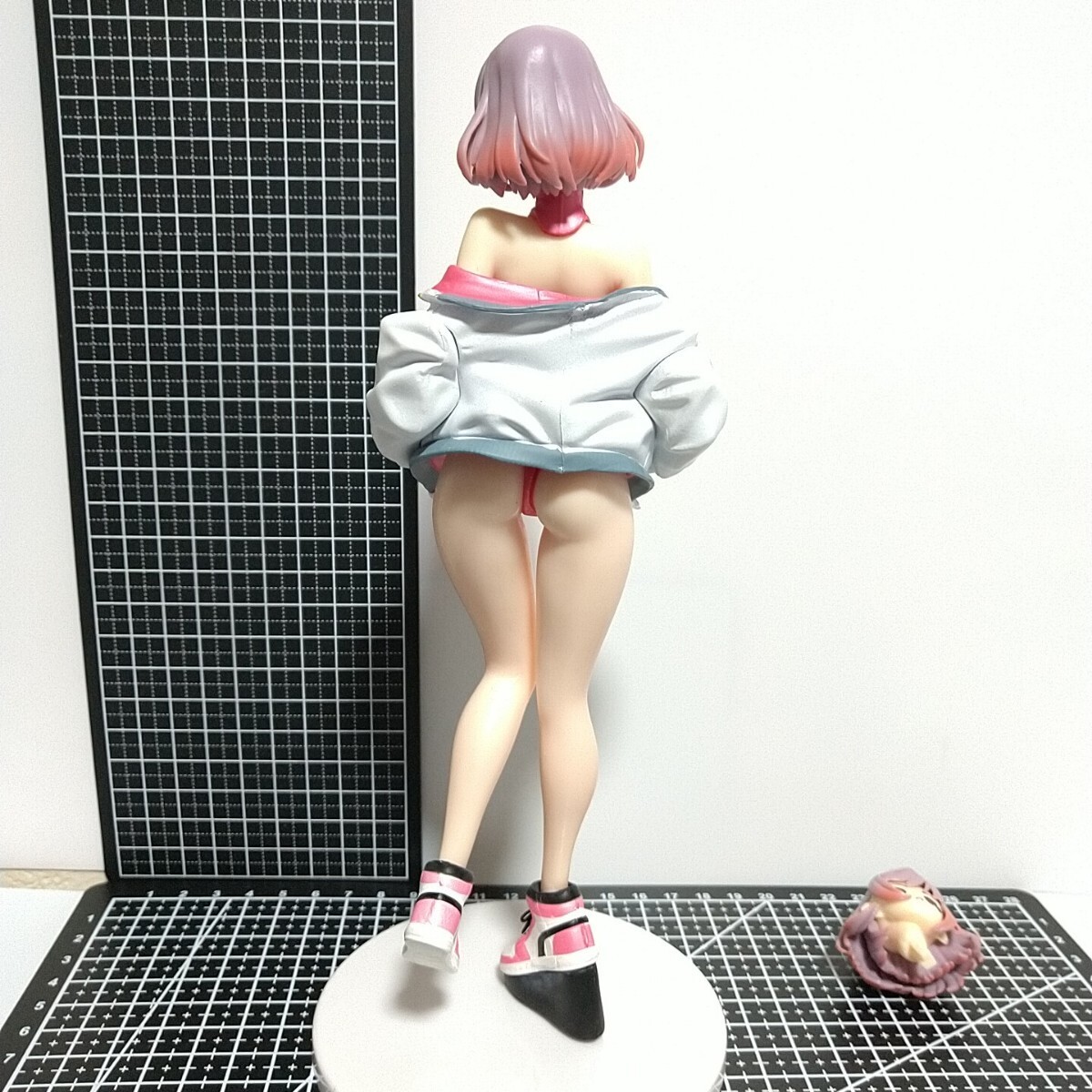 このフィギュアでは、ピンク色のハイレグ水着に白を基調としたジャケットとスポーティな靴を合わせた、おそらくレースクィーンの姿が描かれています。その鮮やかな装いが、華やかで色めく印象を与えます。